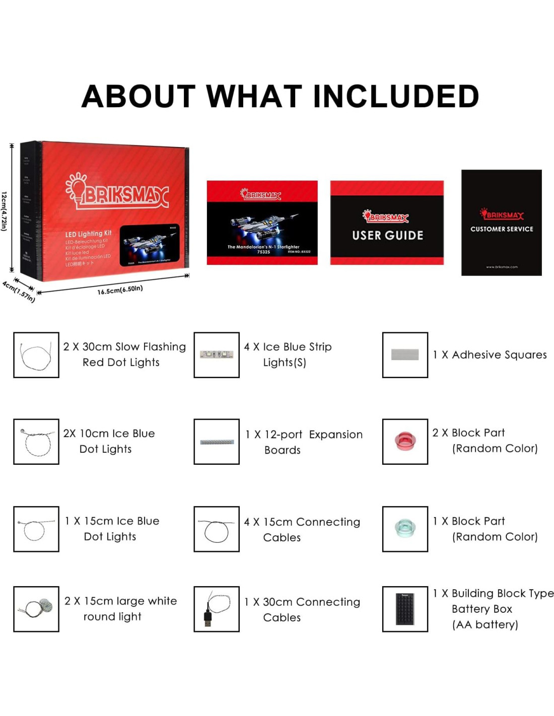 Este kit de luz está especialmente diseñado para LEGO 75325. Te sentirás increíble una vez que hayas terminado la instalación. Tu modelo de LEGO ya no estará en la sombra. En cambio, brillará con la ayuda del kit de luz. Y podrás disfrutar de la vista nocturna del set de La N-1 Starfighter de The Mandalorian en cualquier momento. Así que, haz una gran actualización para tu set con los Kits de Iluminación LED BRIKSMAX y da vida a tu set de LEGO ahora. Consejos de Instalación: Por favor, instala tus luces LED con cuidado, no las tires ni las dobles en exceso o las agites, evita daños y puedes extender su vida útil.