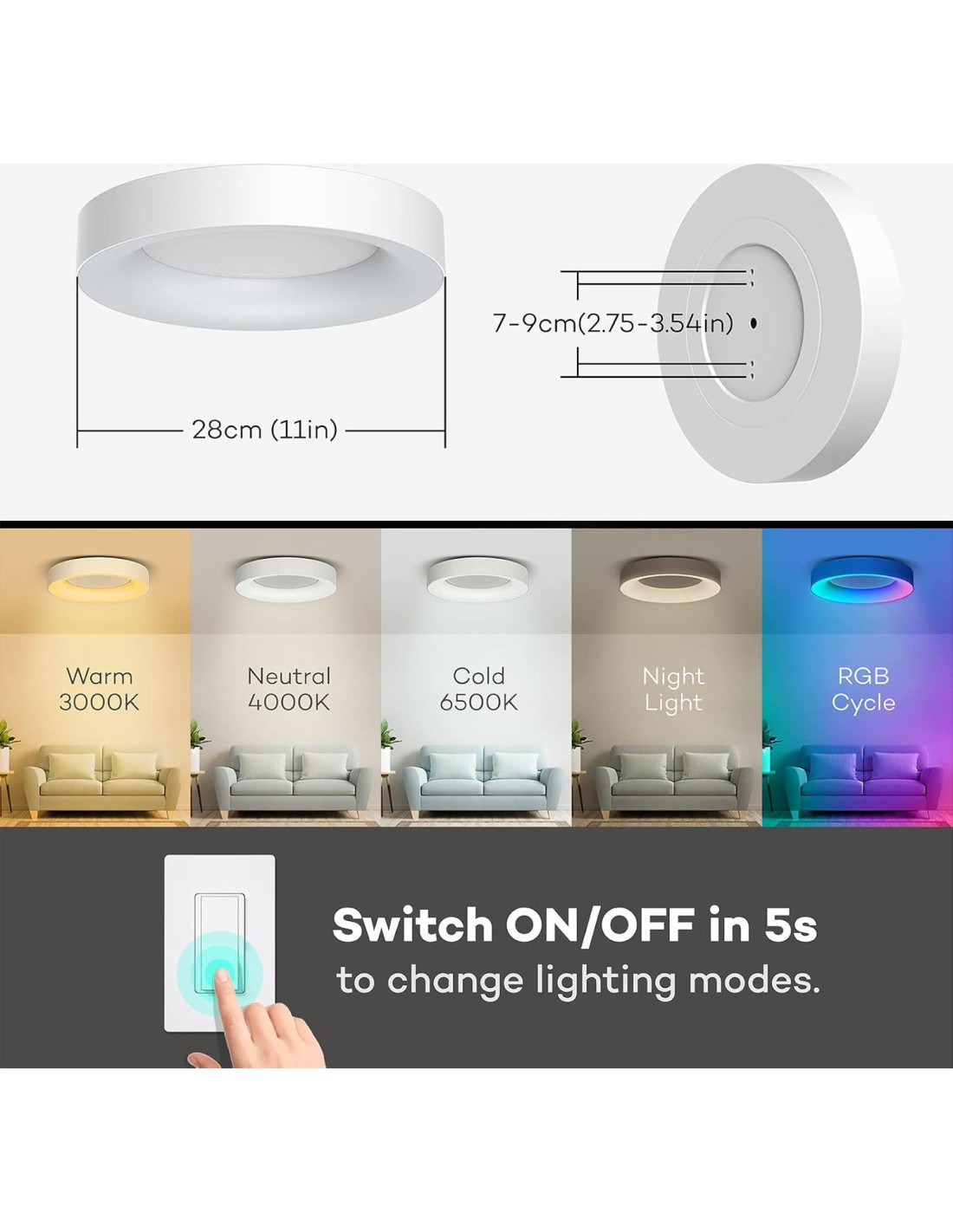 - 4 Modos de Iluminación: La luz de techo RGB Annaror te ofrece 4 modos de iluminación: Luz Diurna Regulable 3000K-6500K; Función de Luz Nocturna; Luz Cambiante RGB (7 Colores opcionales); Modo Ciclo RGB. Una lámpara de techo para múltiples propósitos.