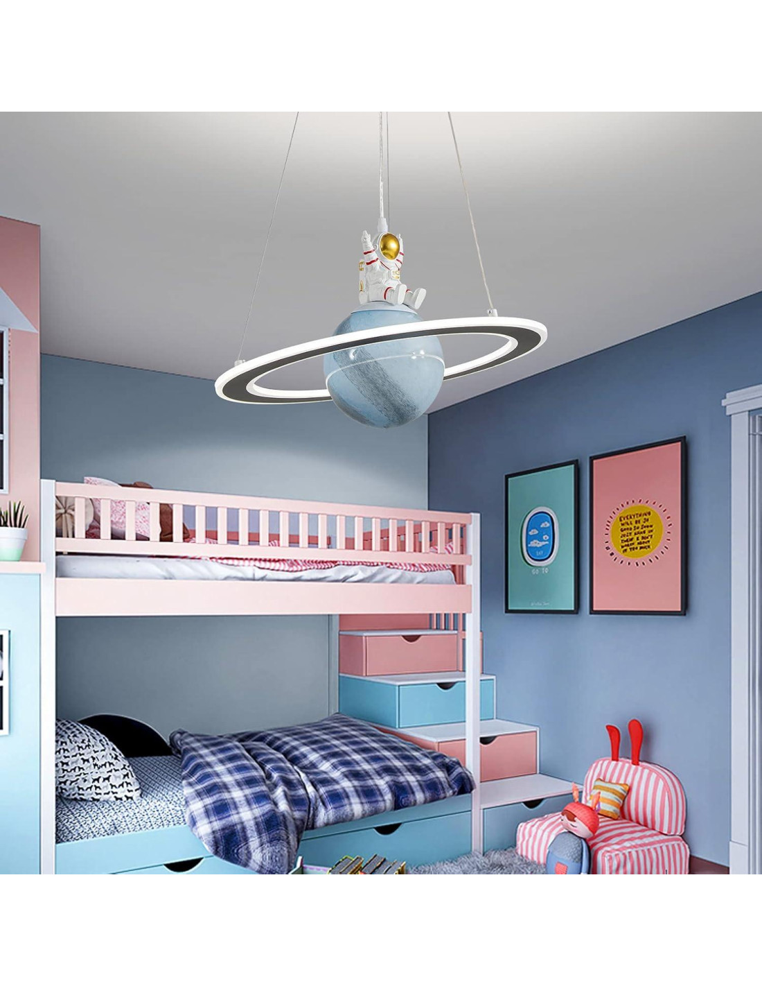 - Lámpara colgante de astronauta regulable de alta calidad: Planeta de vidrio de resina engrosada, figura de astronauta hecha de resina inofensiva, placa de hierro de alta capacidad de carga segura y cables de acero ajustables estables.