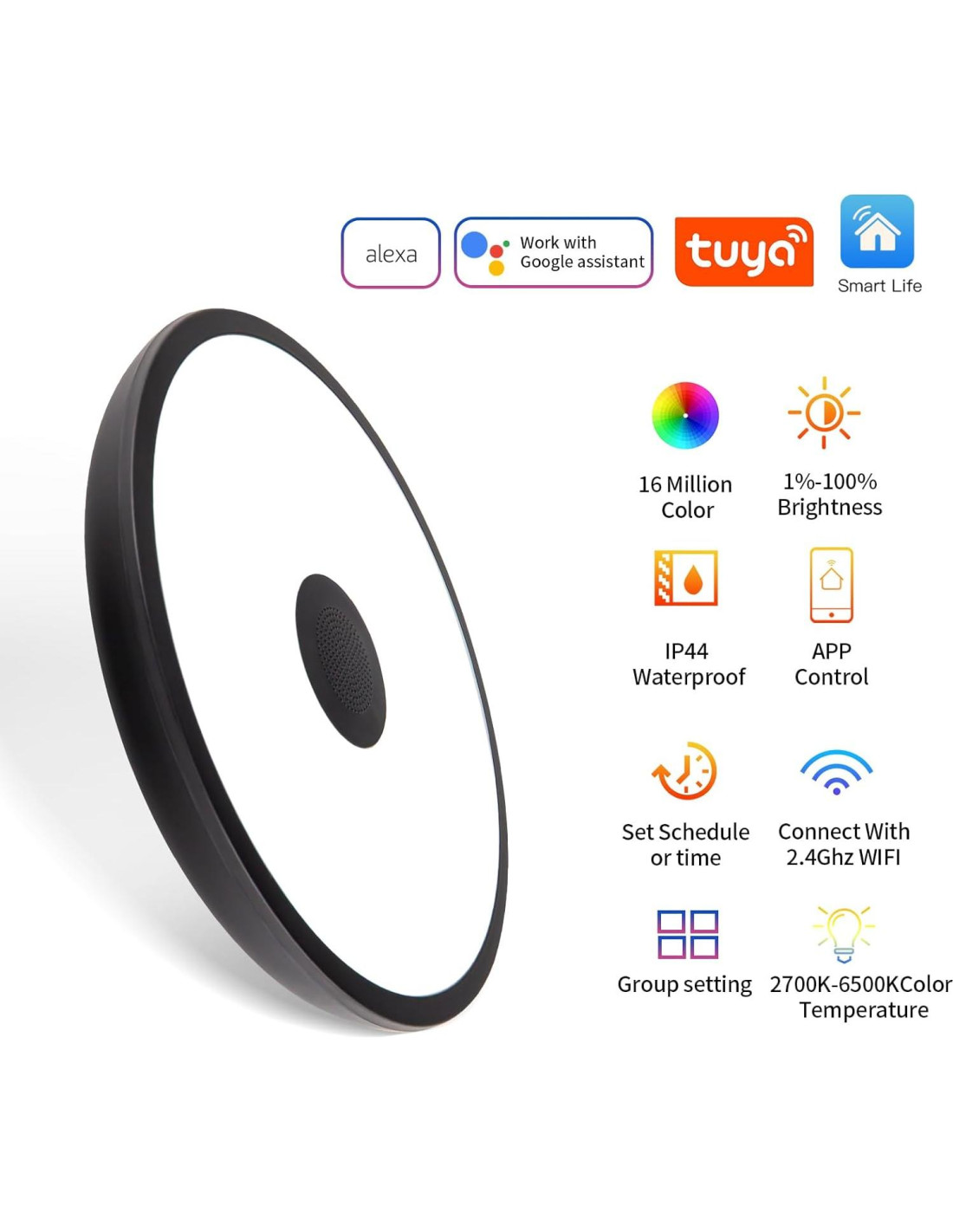 - Soporte multifuncional: Las siguientes funciones se pueden lograr a través del control remoto o la aplicación Tuya: luz cálida, luz neutra, luz fría, función de atenuación de temperatura de color, función de ajuste de brillo del 1% al 100%, modo de luz nocturna, modo de escena, modo de ritmo musical, función de cambio de color RGB, función de temporizador, función de siguiente canción y función de ajuste de volumen.