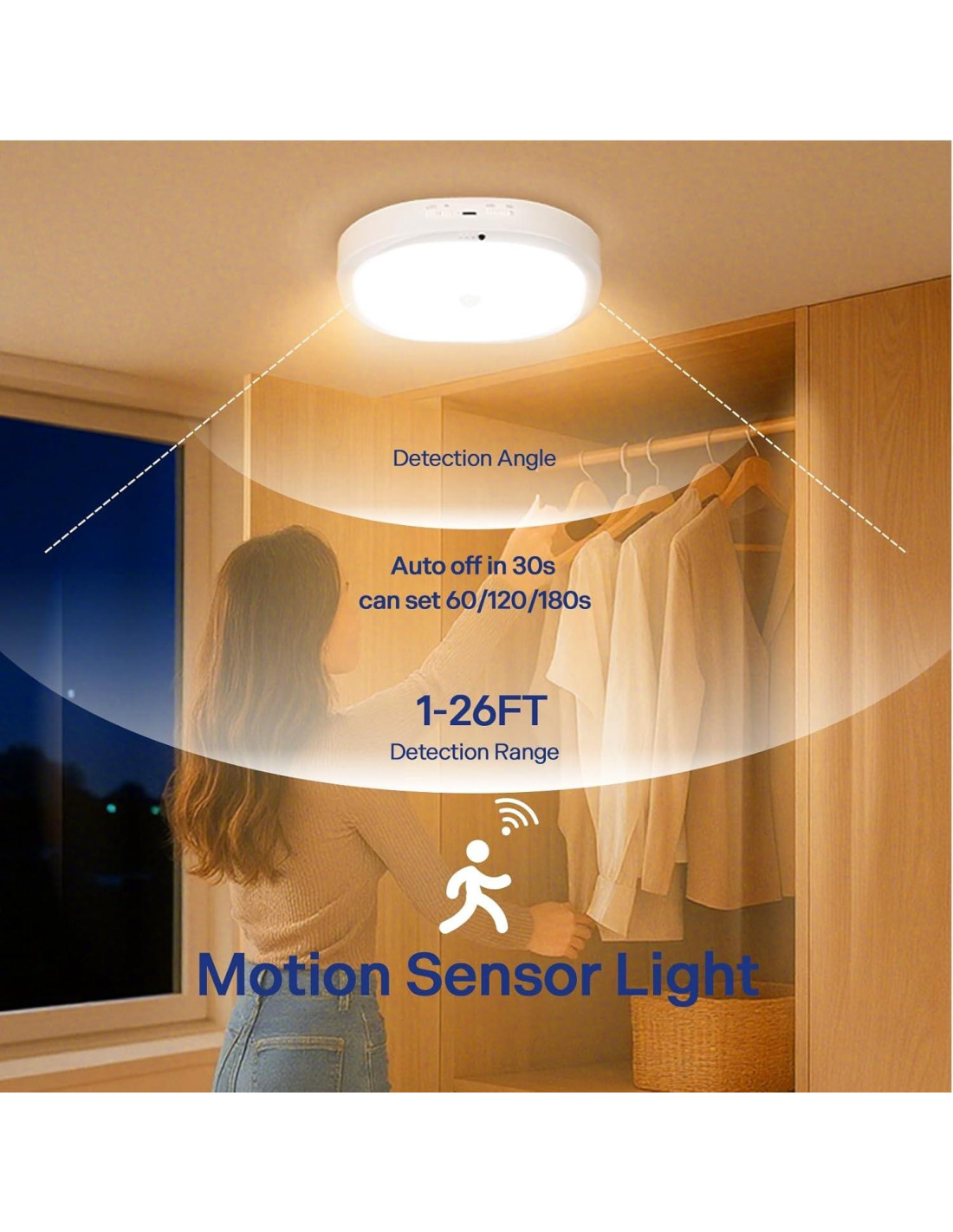 - Modos de Iluminación Inteligente 3 en 1: En Modo [Todo el Día], la luz con sensor de movimiento se encenderá automáticamente 30s cuando se detecte movimiento dentro de 1-26 pies (0.3-8 metros) todo el día. En Modo [Noche], la luz solo se activa por oscuridad. En Modo [Estable], la luz de techo operada por batería siempre estará encendida como una luz LED continua