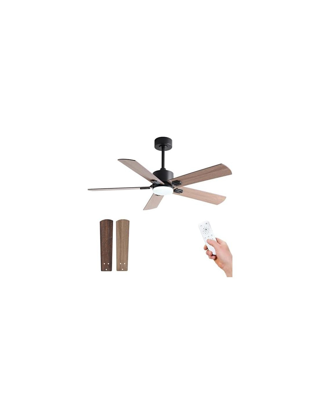 - Características especiales: Ventilador de techo de 42 pulgadas con control remoto de 6 velocidades, Ventilador de techo de 42 pulgadas con luces LED de 3 colores ajustables y memoria de iluminación, Luz de ventilador de techo con 5 aspas de ventilador de madera de doble cara, Ventilador de techo negro moderno con luz, Ventilador de techo DC tiene función de avance y reversa