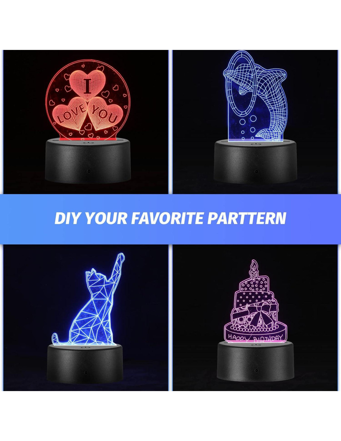 - El paquete incluye: el conjunto de base de luz LED incluye 12 placas acrílicas transparentes, 12 piezas de soportes de lámpara LED nocturna 3D, 12 cables de carga y 12 controles remotos, apto para hacer tus manualidades DIY, puedes grabar diferentes patrones en la placa acrílica y exhibirlo con la base de lámpara LED, brindándote efectos visuales 3D geniales.
