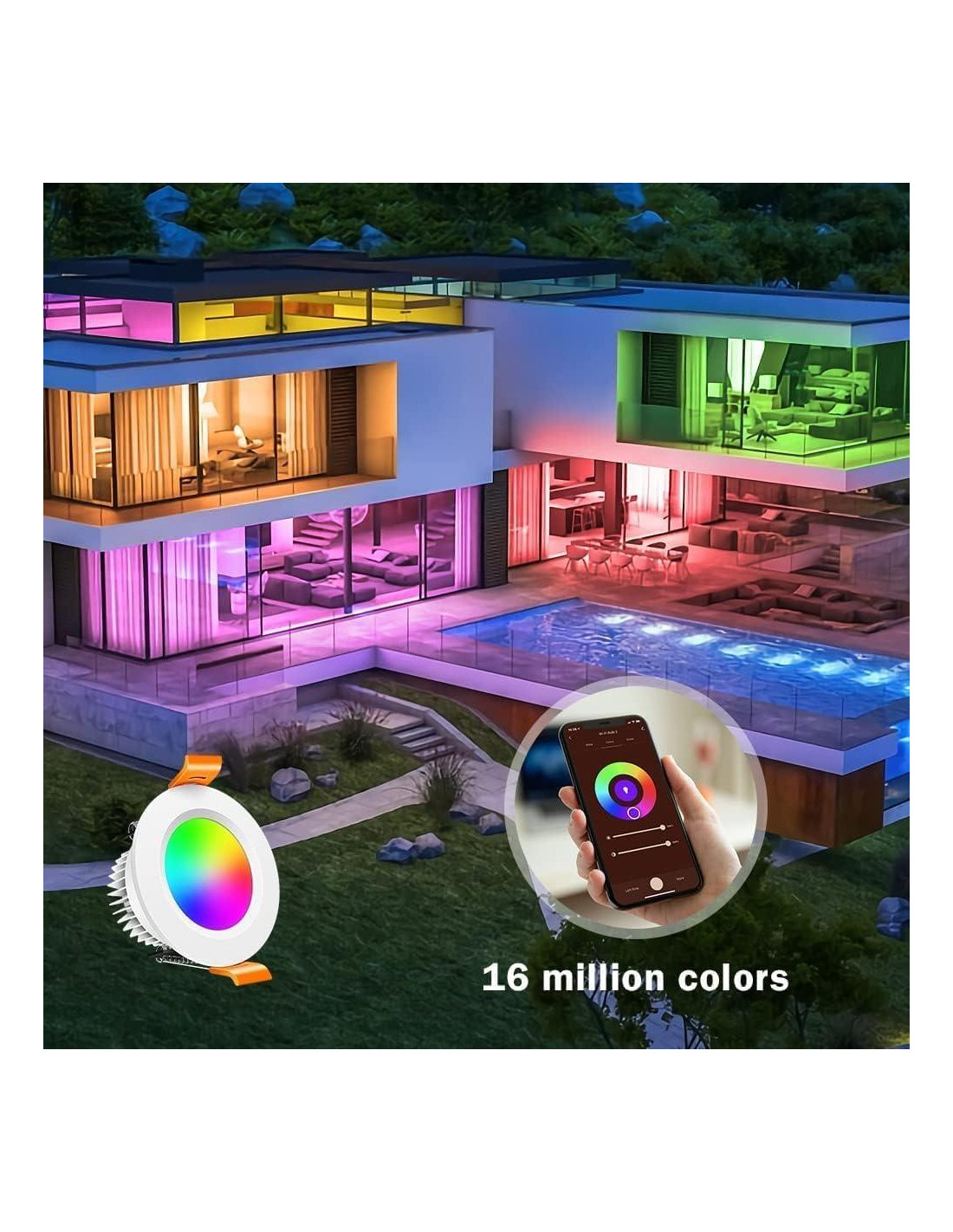 - Control inteligente Wi-Fi: Controla fácilmente tu iluminación empotrada inteligente con Alexa y Google Assistant; ajusta tanto el color como el brillo a través de simples comandos de voz