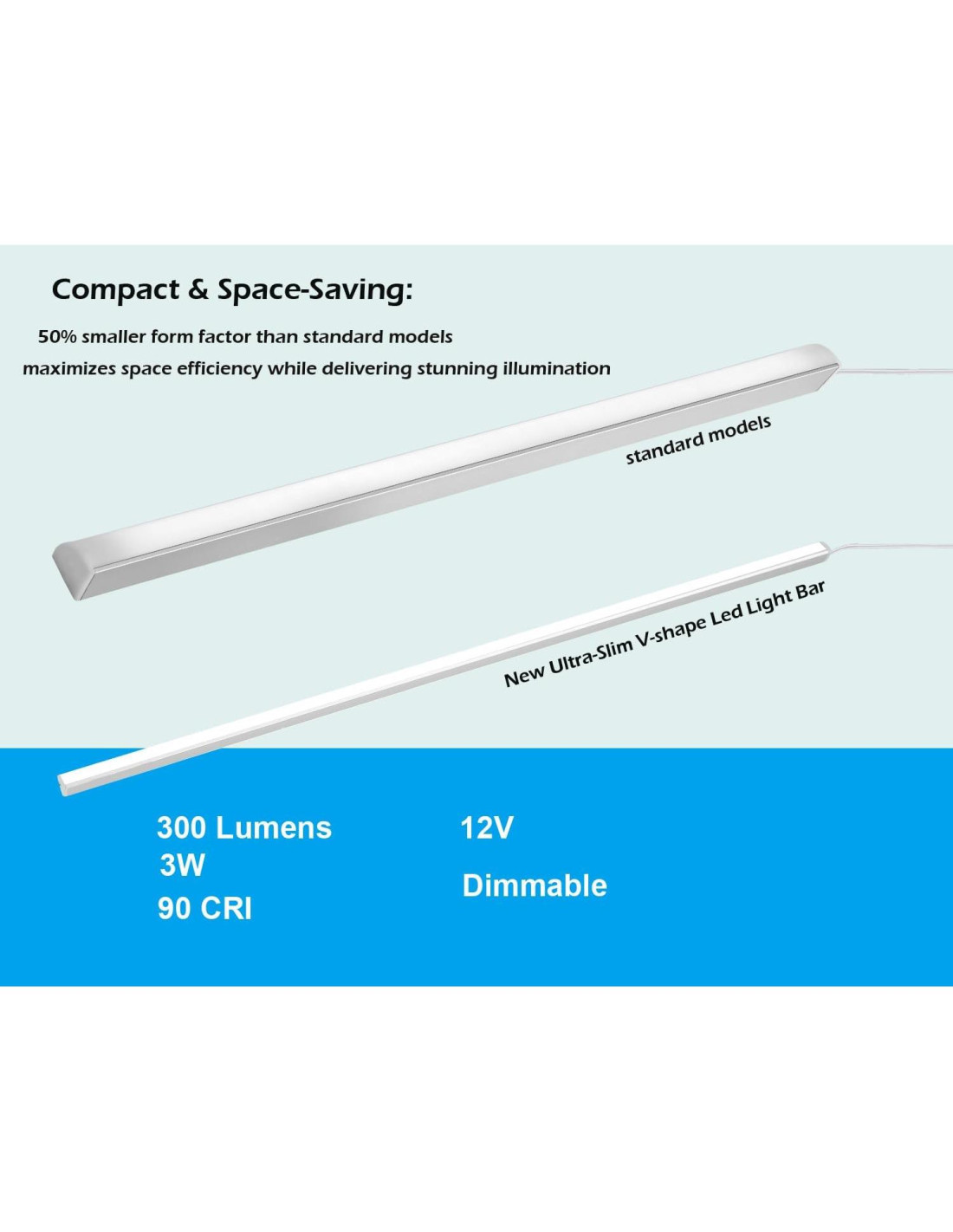 Ve la Luz, No el Fijador: Experimenta la magia de la iluminación oculta - nuestro diseño en forma de V asegura que todo lo que veas sea la hermosa luz que emite. Potencia y Brillo Inigualables: Hemos mantenido la misma potencia y lúmenes que amas, asegurando un espacio brillantemente iluminado. Regula a tu Manera: Eleva tu ambiente con la función de atenuación añadida para un control total de la iluminación. Todo el conjunto de luces bajo gabinete es 1200lm 12W, ahorra 85% de energía. Brillo suave blanco cálido de 3000K, ilumina cualquier rincón oscuro, luces perfectas para cocina, armario, alacena, estante, etc. Diseño en Forma de V, perfil bajo y ligero. La cubierta de PC esmerilada hace que la luz sea más suave para los ojos. El voltaje de esta luz es DC12V, lo que las hace seguras al tacto. Elaboradas con materiales de alta calidad, nuestras barras de luz están diseñadas para durar. El diseño delgado y de perfil bajo asegura que se ajusten perfectamente y de manera discreta en cualquier espacio. Disfruta de una iluminación confiable y duradera que iluminará tu espacio durante años. Más allá de los gabinetes, estas barras de luz son perfectas para varios entornos como armarios, casilleros, debajo de mostradores y estantes. Pueden ser utilizadas en dormitorios, garajes, talleres, o incluso en tiendas de campaña y sitios de camping.