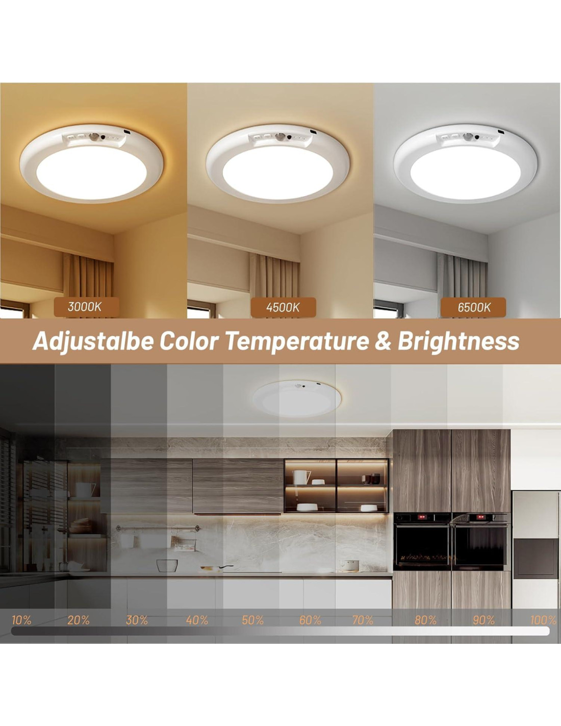 - Luz de Techo Activada por Movimiento: Nuestra luz de techo inalámbrica tiene tres modos disponibles. Modo de detección diurna, modo de detección nocturna y modo siempre encendido. En el modo de detección diurna, se detectará movimiento todo el día cuando te acerques a 9-12 pies (2.74-3.66 m) y se apaga automáticamente después de 20 segundos. En el modo de activación por movimiento nocturno, el sensor de movimiento solo funciona en la noche o en la oscuridad. En el modo siempre encendido, funcionará como una luz normal sin la función de sensor de movimiento. Fácil de cambiar de modo tanto presionando el botón en el producto como con el control remoto.