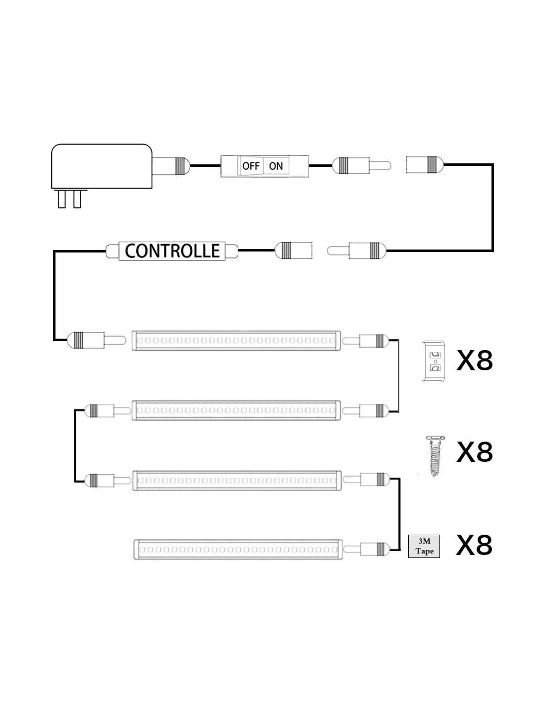 Simplemente conecta todos los accesorios de las luces como muestra la imagen. Todas las luces se pueden enlazar en serie con dos tipos de cables de conexión de diferentes longitudes. Es fácil montar las luces en tus gabinetes con los elementos de instalación. Después de completar la conexión, tendrás una buena experiencia de uso con estas barras de iluminación bajo gabinete dimmables. Una gran opción para los gabinetes, mostradores, estantes y alacenas en la cocina. Adecuado para el estante de ropa, armario y mostrador de ropa en el vestidor. Perfecto para todo tipo de superficies de trabajo, encimeras y bancos de trabajo en el taller o la oficina.