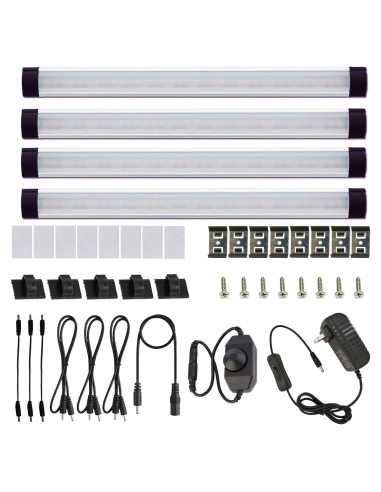 - @ ENCHUFA Y JUEGA: Las barras de luz de cocina bajo gabinete son muy fáciles de montar y conectar. El paquete de 4 luces de tira se puede cablear directamente una por una, con pegatinas de doble cara o tornillos. Si necesitas más clips de cable para ayudarte a instalar las luces, por favor cómpralos con el ASIN: B085DC5F9S.