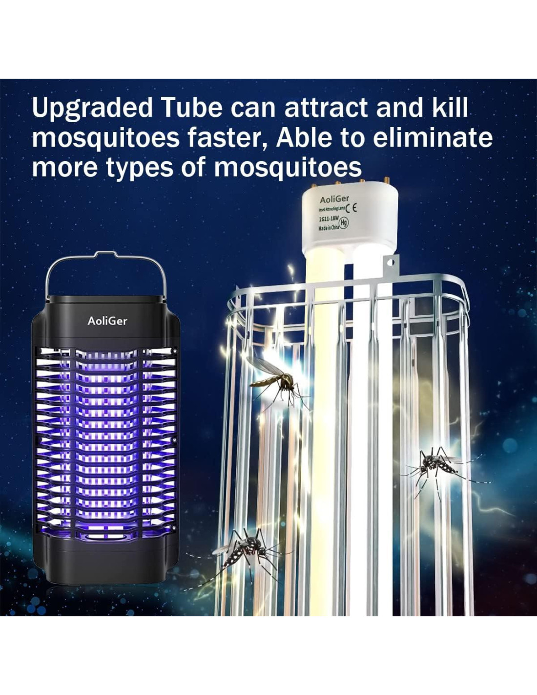 - [Asesino de Insectos Físico Efectivo] La bombilla de 18W del asesino de mosquitos utiliza luz azul-violeta, que puede atraer a la mayoría de los insectos voladores: mosquitos, mosquitos Aedes, pequeños mosquitos, mosquitos de arena, moscas, tábanos, moscas de la fruta, moscas domésticas, polillas, avispas, etc., y luego los insectos son electrocutados a través de una rejilla de alta tensión de 4200V.
