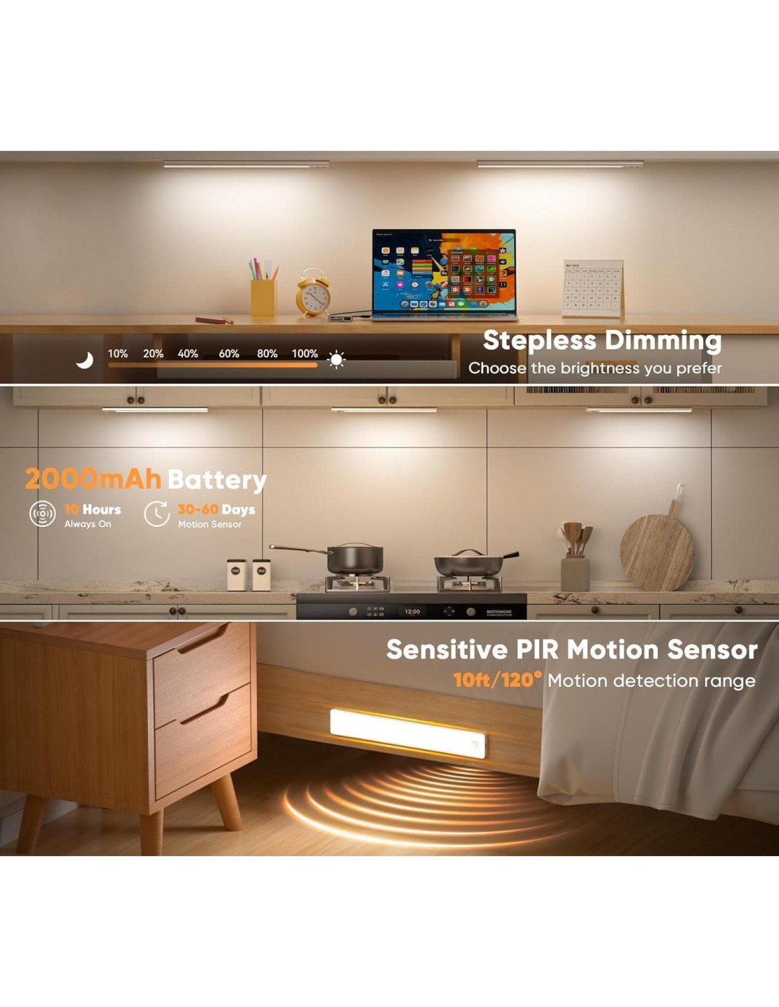- 3 Temperaturas de Color y Regulación Sin Escalas La iluminación bajo gabinete recargable presenta tres temperaturas de color (3000K cálido, 4500K natural y 6500K blanco frío) y regulación sin escalas del 10% al 100% de brillo. Cambia fácilmente entre estilos de iluminación y ajusta el brillo para adaptarse a cualquier ocasión y mejorar tu espacio.