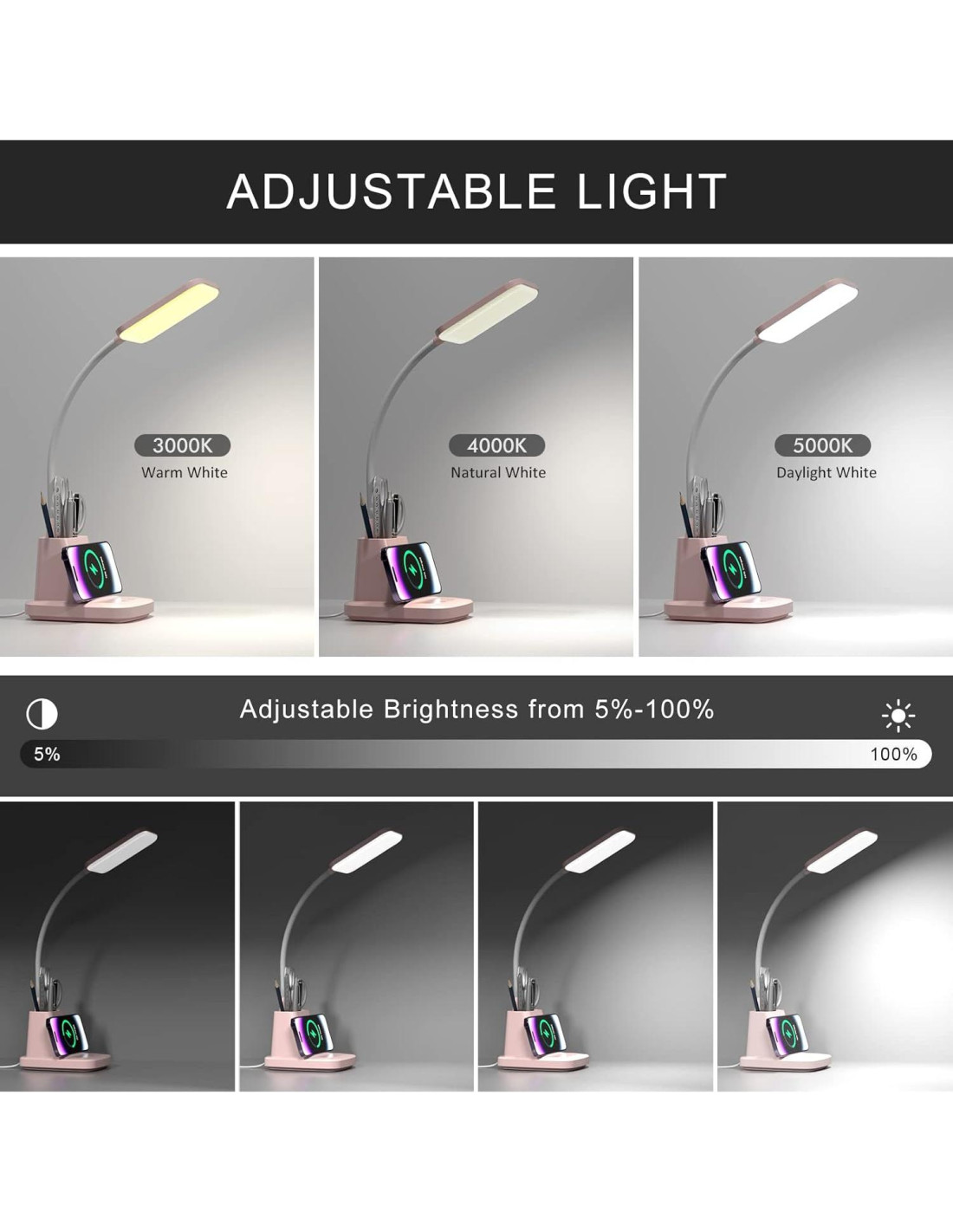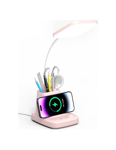 - Lámpara de Escritorio con Carga Inalámbrica: Esta lámpara de estudio rosa viene con una base de carga inalámbrica incorporada, que soporta una velocidad máxima de 10W y cubre las necesidades de dispositivos compatibles con Qi.