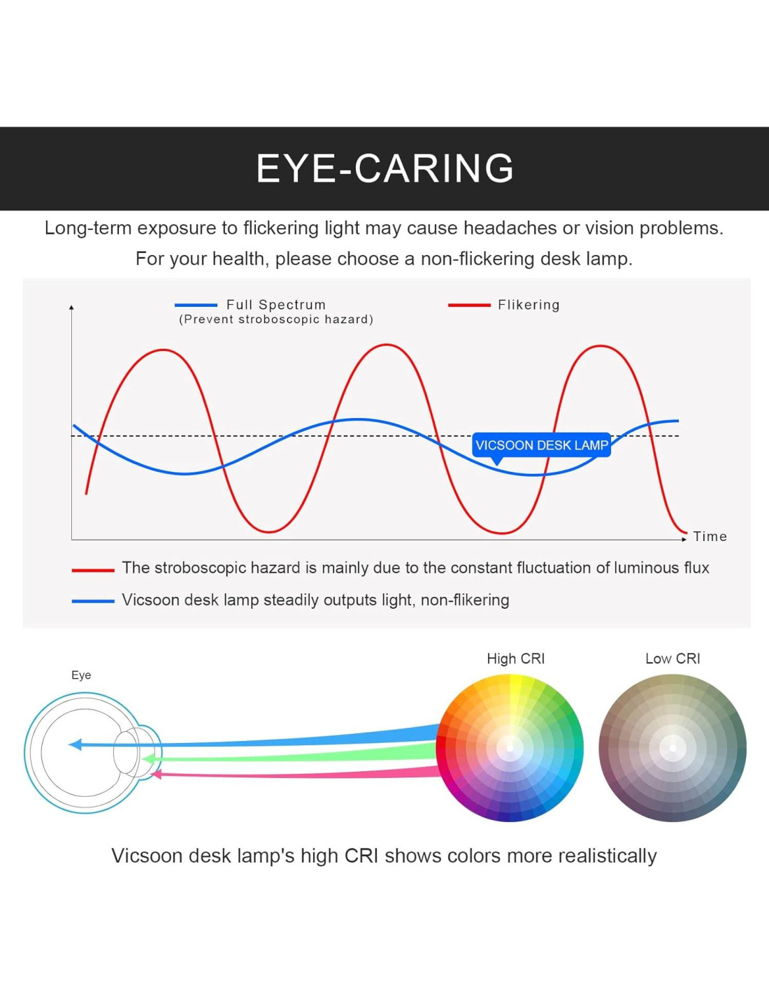 - Lámpara LED que Cuida los Ojos: Las lámparas de escritorio superbrillantes tienen 56 perlas LED que pueden producir 800 lúmenes de luz a una potencia máxima de 8W. Tienen una vida útil de 50,000 horas y una tasa de CRI de 90+. Incluso usadas durante períodos prolongados, un panel acrílico y la suave luz no parpadeante ayudan a prevenir la fatiga ocular.