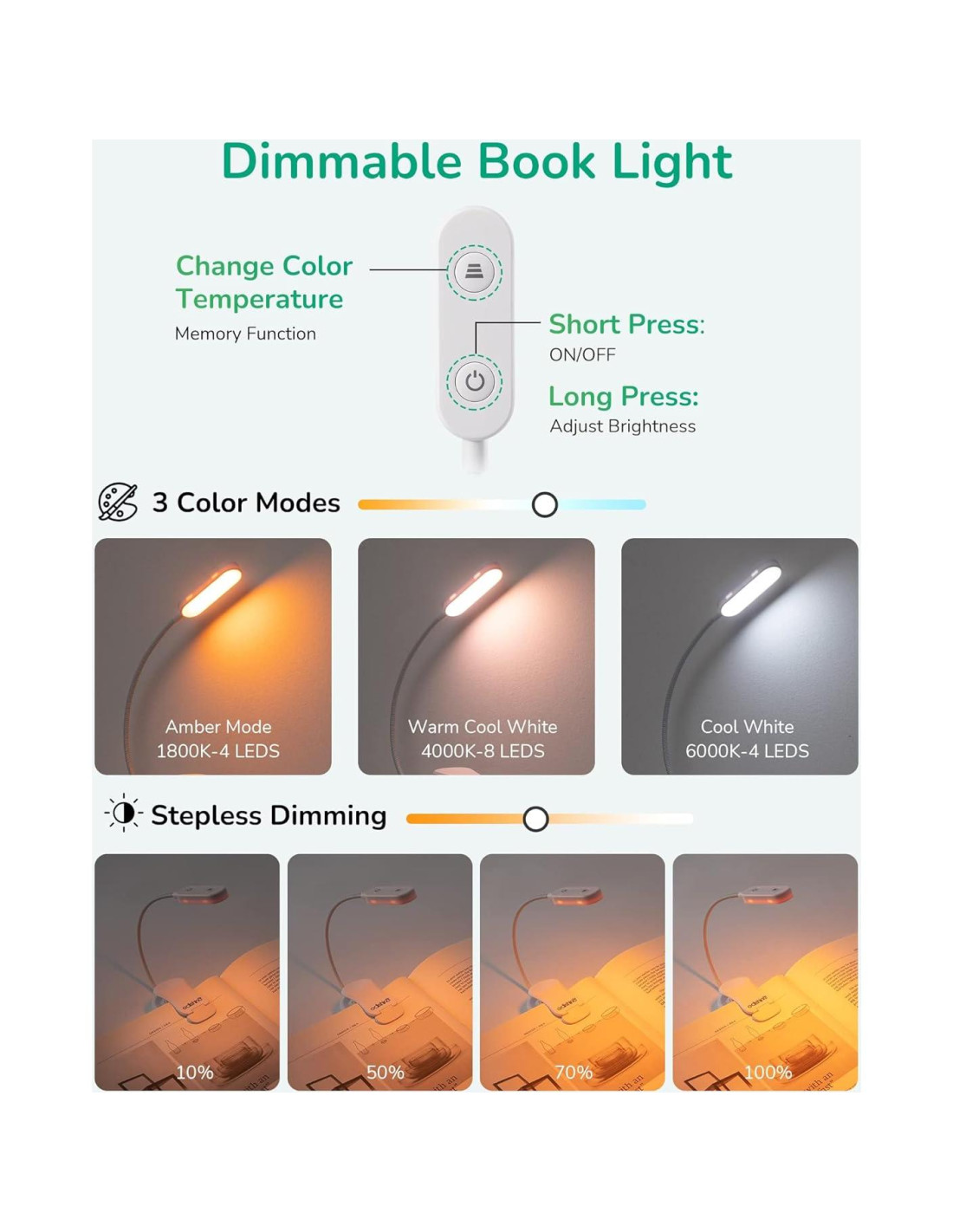 - [3 Modos de Color y Regulable Sin Escalones] Con 3 opciones ajustables para brillo ámbar-1800K, blanco cálido-4000K, blanco frío-6000K y función regulable sin escalones (10%-100%), nuestra luz de lectura puede proporcionar múltiples configuraciones de brillo y temperatura de color, satisfaciendo tus diferentes necesidades; lo suficientemente brillante para usar en la lectura nocturna, costura y manualidades pero no lastimará tus ojos