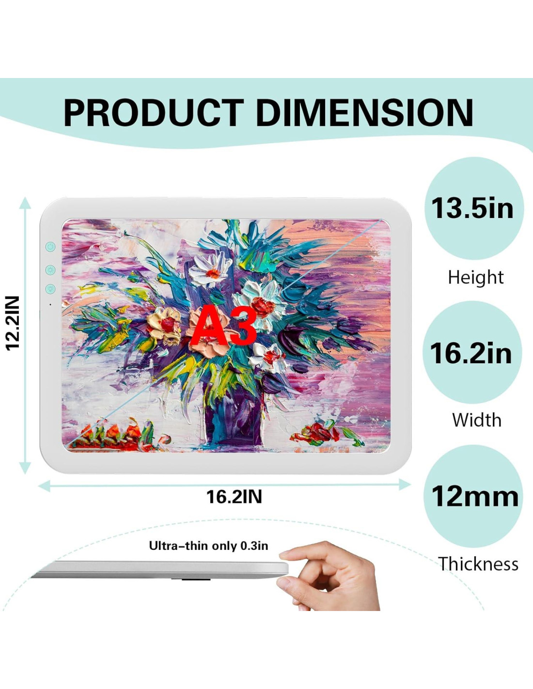 - Usos recomendados para el producto: Almohadilla de Luz A3 para arte de diamantes, deshierbe de vinilo, visualización de diapositivas, plantillado, animación 2D, caligrafía, embellecimiento, scrapbooking, transferencia de tatuajes, esbozo y dibujo, transmisión, proyectos de costura, vidrio de colores, plantillas de acolchado, negativo de película, etc.