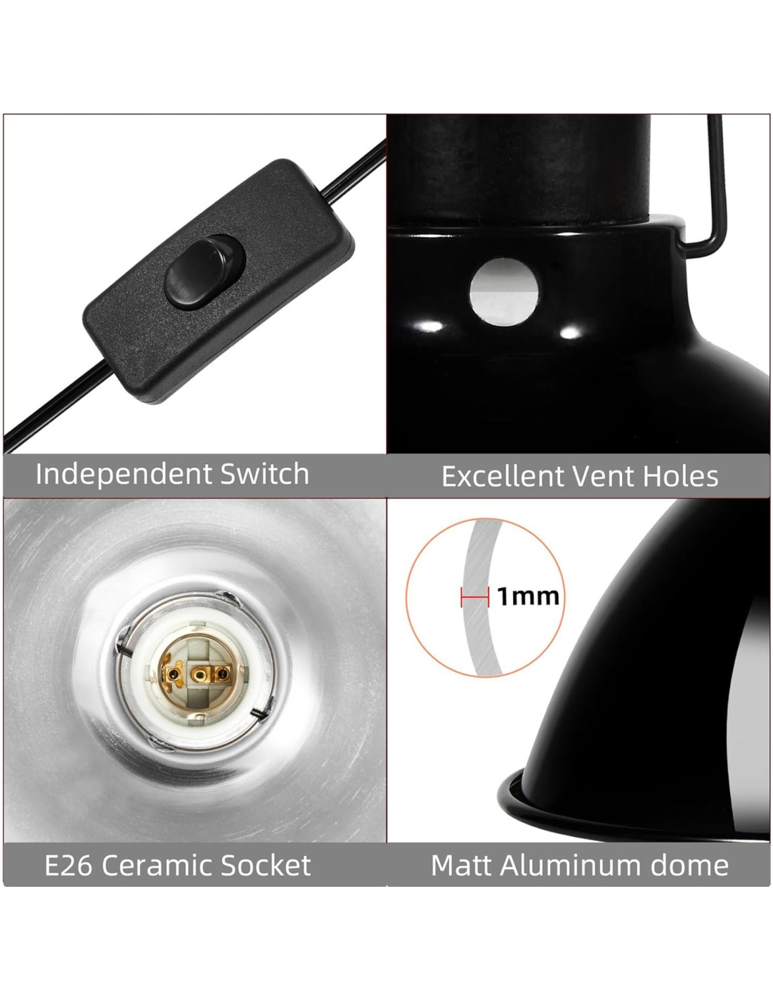 - Alta Calidad y Alta Reflexión: La capa interna de la fijación de luz de domo reflector para reptiles está hecha de material de aleación de aluminio de alta calidad con un grosor de 1mm. La fijación de luz para terrarios está bien pulida para reflejar eficazmente el calor y aumentar el brillo. Mejora la salida de fuentes de luz UVA y UVB, proporcionando un ambiente de luz y temperatura cómodo para tu mascota.