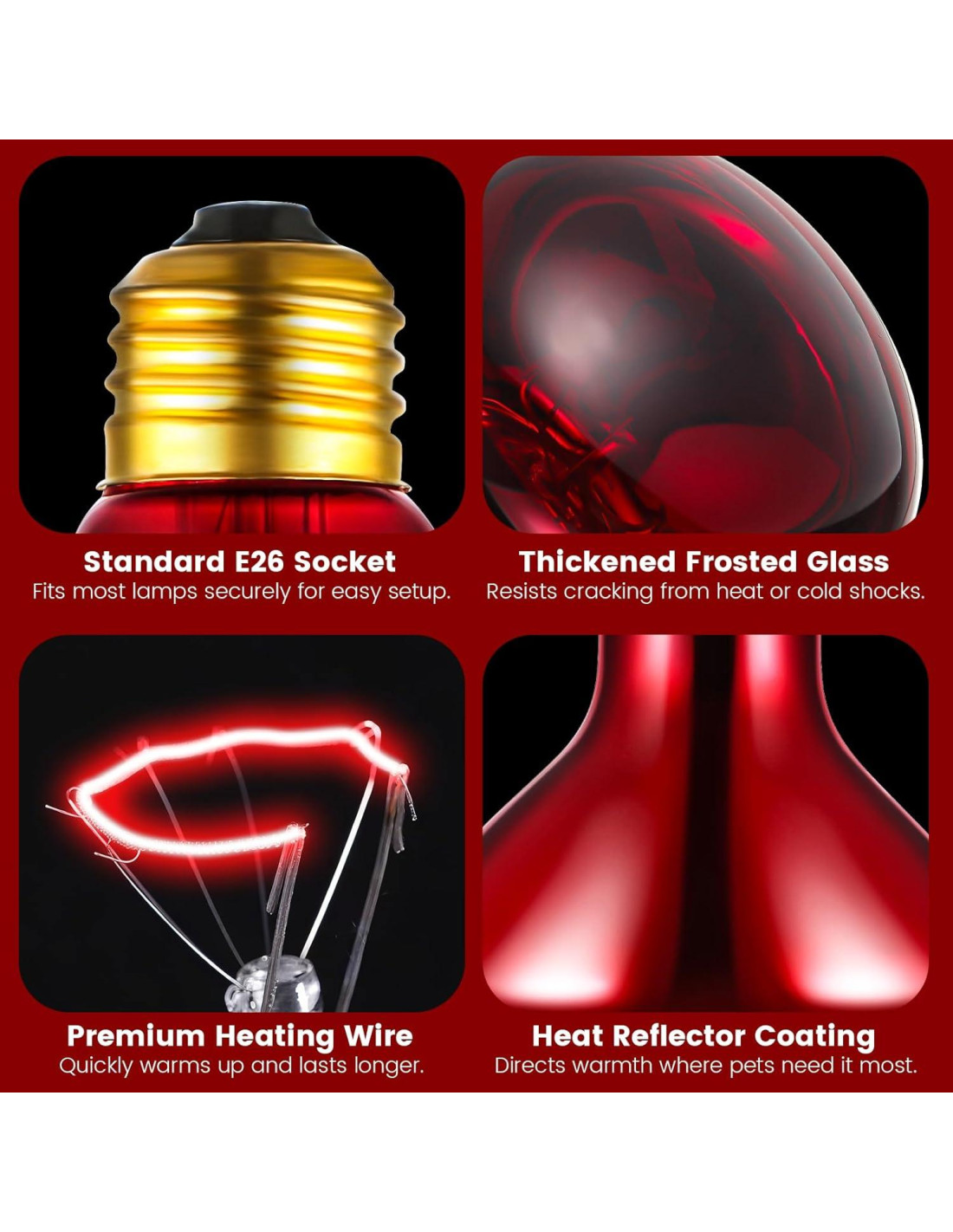 - Estabilidad y Seguridad: Nuestras lámparas de calefacción para reptiles están hechas de vidrio de alta calidad y resistente a altas temperaturas, que puede soportar choques térmicos mucho mejor que el vidrio ordinario. A través de múltiples capas de estrictos procesos de control de calidad, la probabilidad de que la bombilla de calefacción estalle durante su uso se reduce significativamente. Esto asegura un ambiente de calefacción seguro y estable para sus reptiles, dándole tranquilidad mientras les proporciona el calor que necesitan.