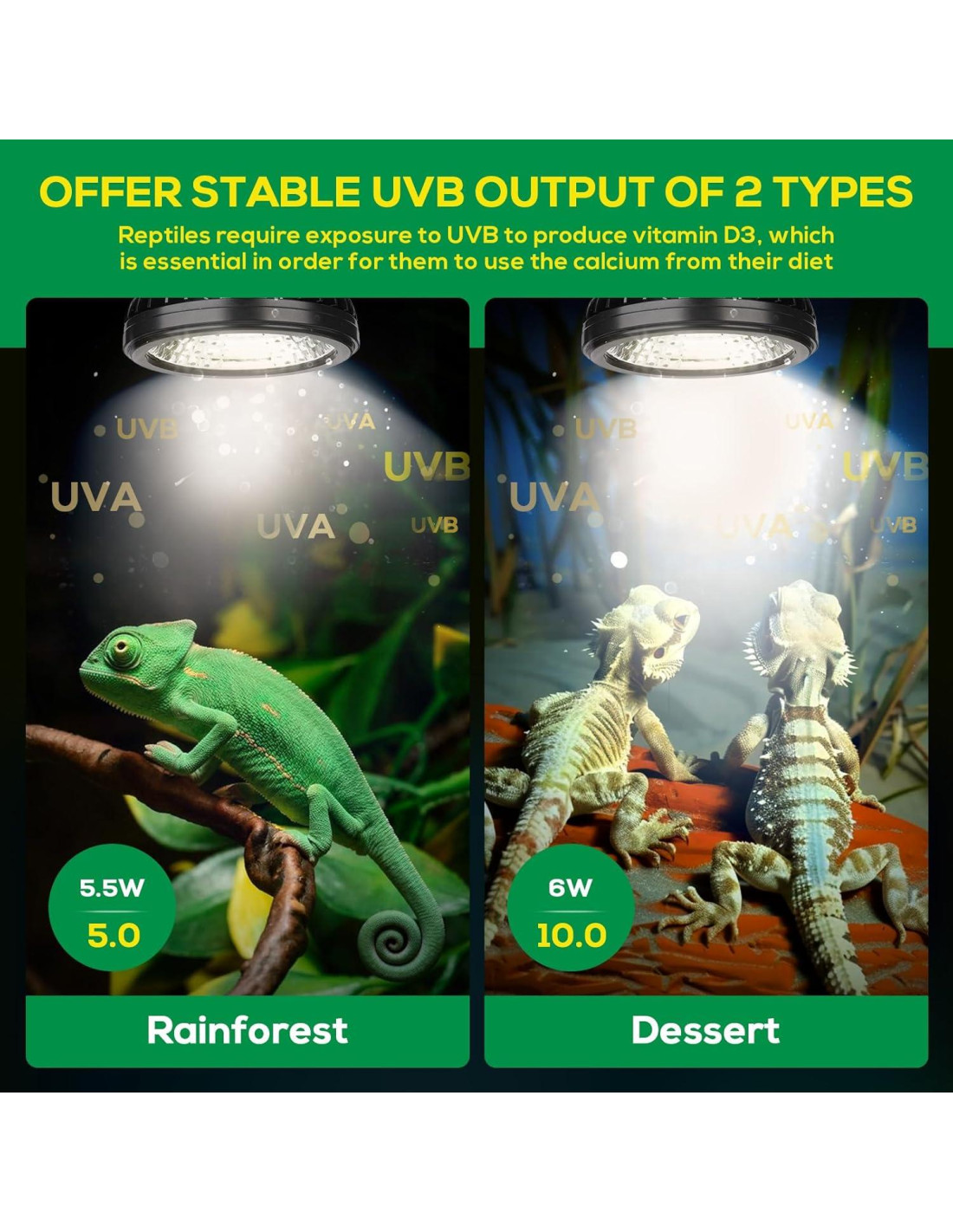 - Altamente eficiente y ahorradora de energía: nuestra luz UVB para reptiles con bombillas LED eficientes y ahorradoras de energía como iluminantes, su eficiencia luminosa es 2-3 veces mayor que la de las lámparas fluorescentes compactas tradicionales. El contenido de UVA y UVB en las bombillas es similar a la proporción de la luz solar natural. La temperatura de color blanco cálido de 5000K utilizada en las perlas blancas es más suave y cómoda que la temperatura de color de 6500K de las lámparas fluorescentes, promoviendo la absorción de calcio y asegurando la salud de los reptiles.