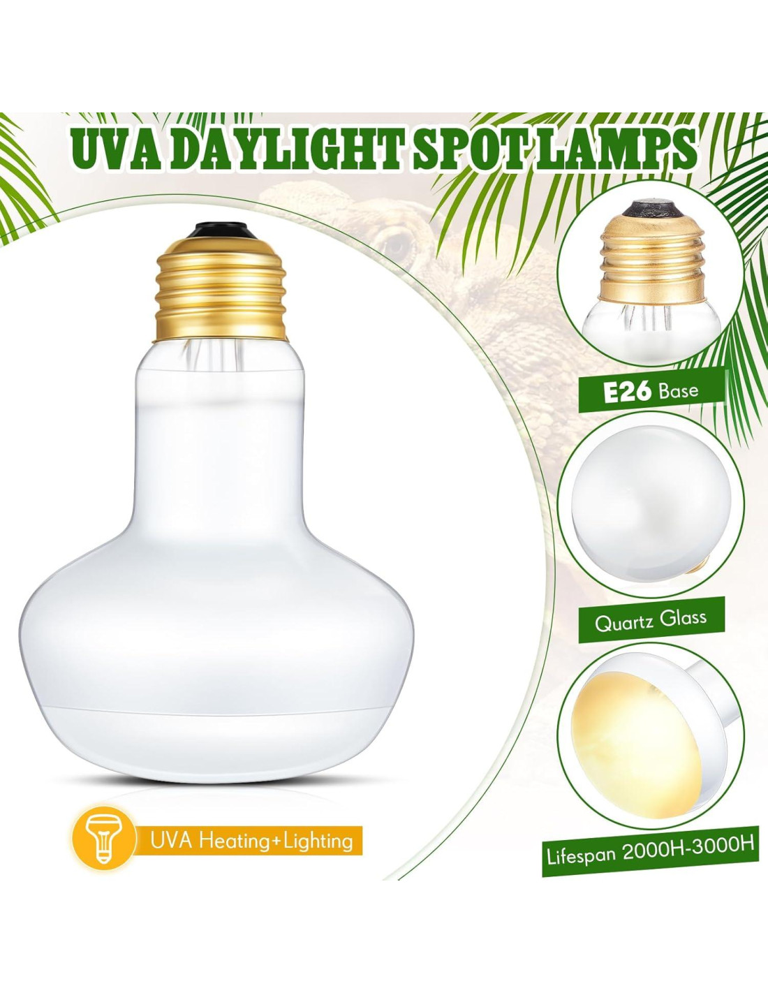 Características: Tamaño óptimo para aplicaciones versátiles: Tamaño de aproximadamente 3.2 x 4.8 pulgadas (10.67 x 12.19 cm), estas bombillas uvb para reptiles se adaptan perfectamente a diferentes espacios y accesorios. Sus dimensiones ideales aseguran compatibilidad con varias configuraciones de base E26, ofreciendo máxima versatilidad para múltiples aplicaciones en su hogar o granja. Efecto de simulación: Cada lámpara de calor para geckos presenta un efecto de simulación, proporcionando condiciones de iluminación natural que apoyan a una variedad de animales. Adecuadas para asegurar la salud y el bienestar óptimos de reptiles y anfibios, estas bombillas imitan el calor y la luz natural que se encuentran en la naturaleza. Especificaciones: Material: vidrio de cuarzo duro Color: plata Tamaño: aproximadamente 3.2 x 4.8 pulgadas (10.67 x 12.19 cm) El paquete incluye: 4 x bombillas de lámpara de calor Notas: Medición manual, por favor permita ligeros errores en el tamaño. El color puede presentar una ligera diferencia debido a diferentes pantallas. Por favor, no las use con reguladores de intensidad, termostatos y reostatos. No toque directamente la fuente de agua cuando la energía esté encendida. Si se aplica para mantener a los animales calientes, mantenga una cierta distancia del animal. La superficie de la bombilla puede estar caliente, así que no toque la superficie con las manos mientras esté funcionando. No cambie las bombillas con frecuencia.