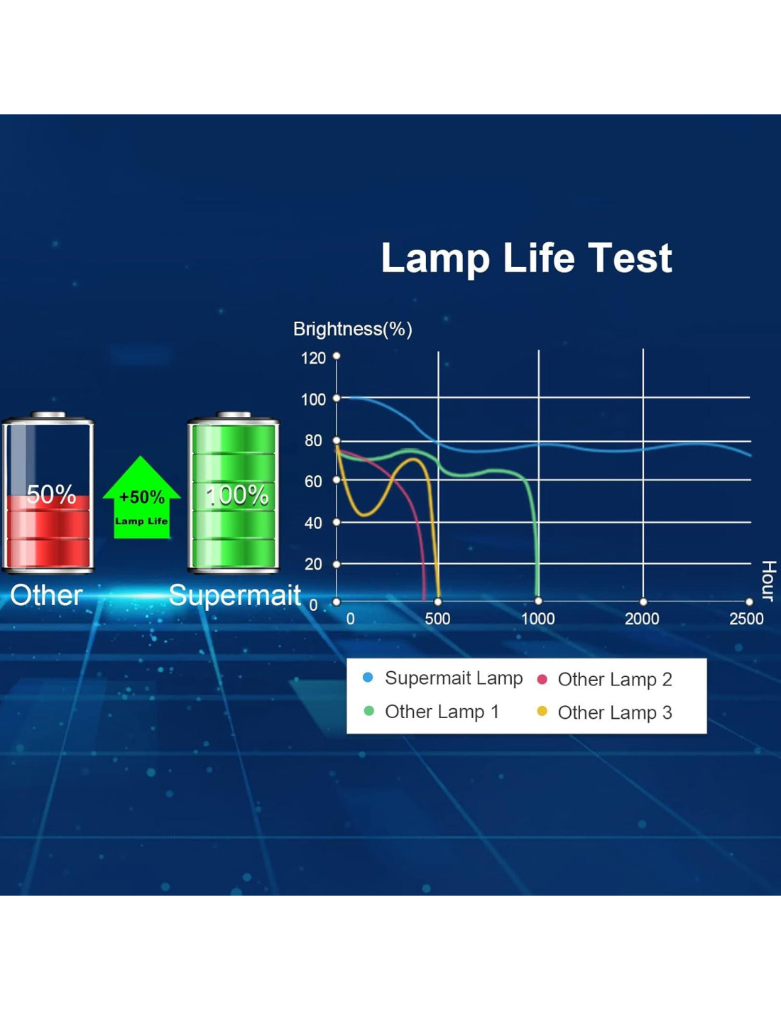 Lámpara / Bombilla de Proyector Original Supermait. Número de modelo del artículo: 5J.JEE05.001 / 5JJEE05001. Modelos compatibles: Compatible con proyectores Benq W1110 / W2000 / W1210ST / HT2050 / HT3050. Por favor, tenga en cuenta las siguientes consideraciones: 1. Asegúrese de que las condiciones de la habitación estén limpias y ventiladas. 2. Cambie o limpie el filtro de aire de su proyector mensualmente. 3. Es mejor dejar que su proyector descanse durante 15 minutos por cada 4 horas de funcionamiento. 4. No desconecte el cable de alimentación antes de que el ventilador de enfriamiento deje de funcionar.
