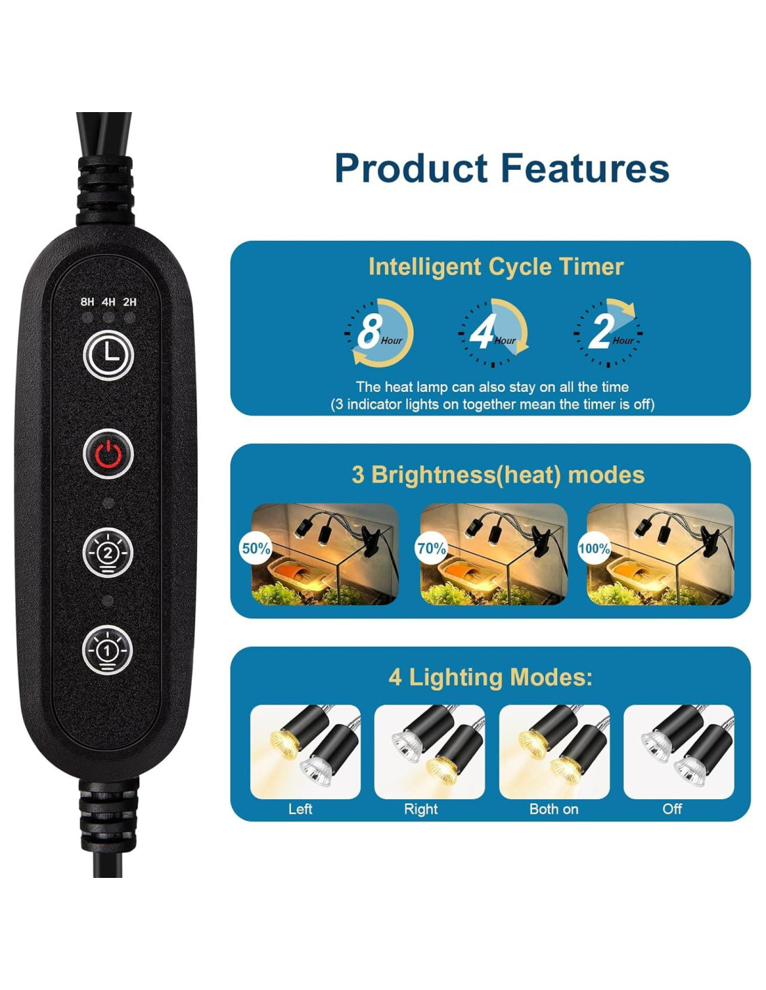 - Brillo ajustable y temporizador cíclico Lámpara de calor para reptiles con el temporizador cíclico inteligente, puede elegir un tiempo de calefacción de 2, 4 u 8 horas. Una vez configurada, la luz para tortugas se encenderá/apagará automáticamente a la misma hora cada día y tiene tres niveles de brillo para ajustar. Cada cabeza de luz puede ser controlada individualmente encendida/apagada. Esto significa que puede elegir encender una o ambas cabezas de luz según sea necesario, dándole la flexibilidad para regular la fuente de calor de su mascota.