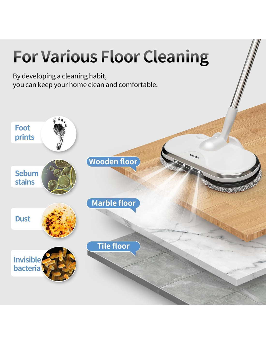 - CABEZAL DOBLE DE GIRO - La mopa inalámbrica AlfaBot está equipada con un motor dual, girando a 150r/min, que empujará automáticamente la cabeza de la mopa hacia adelante para que puedas eliminar manchas difíciles y suciedad en el piso de la casa y la cocina más rápidamente, también puede ser manejada fácilmente por niños y ancianos