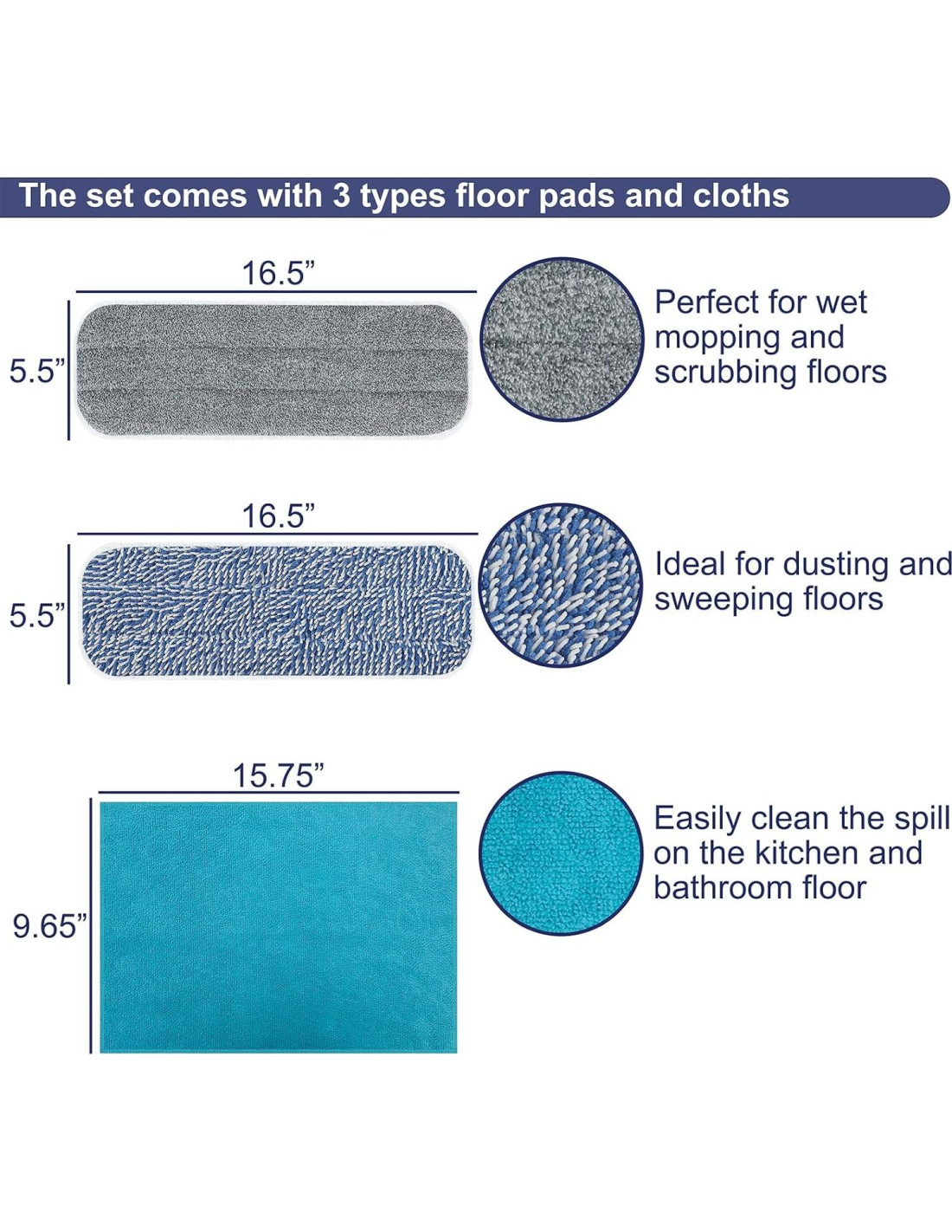 - Almohadilla Lavable para Limpieza Húmeda/Polvo - El sistema de limpieza de pisos incluye tres tipos de almohadillas/paños de mop de microfibra: una almohadilla acolchada altamente absorbente para trapear en húmedo, fregar y eliminar manchas. La segunda es una almohadilla de barrido de chenilla que recoge sin esfuerzo escombros, polvo y pelo como un imán. Además, hay 2 paños de limpieza de microfibra para retoques finales. Todas estas almohadillas/paños de microfibra son lavables a máquina y se pueden reutilizar hasta 300 veces.