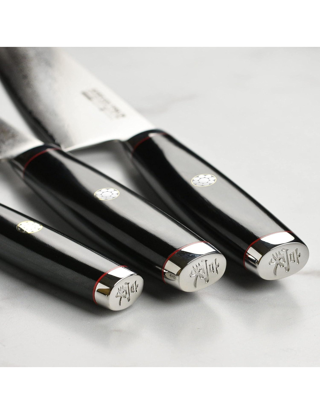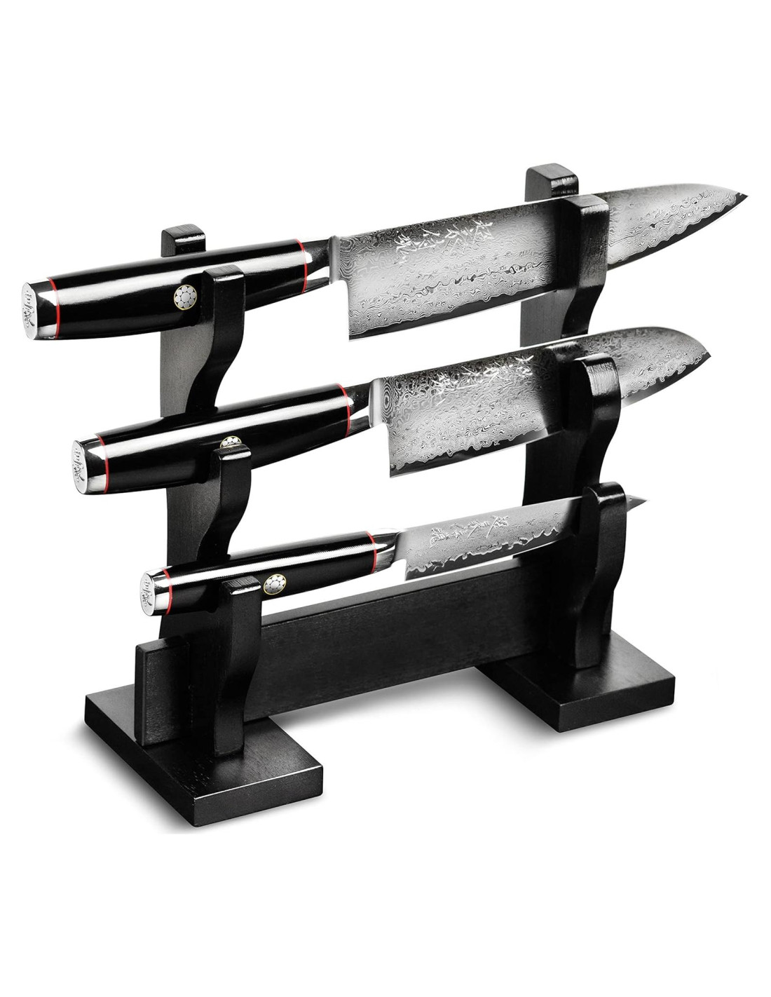 - El set incluye cuchillo petty/utilidad de 12.1 cm (4.75"), cuchillo santoku de 16.5 cm (6.5") y cuchillo gyuto/chef de 20.3 cm (8"). También incluye cubiertas magnéticas de madera para la hoja y el soporte de cuchillo de madera estilo katana para exhibir estas obras maestras en cuchillería
