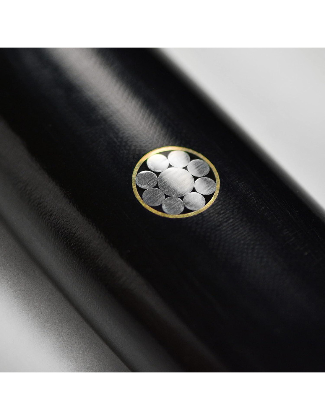 - Mango de micarta de lienzo negro con refuerzo de acero inoxidable 18/10 y tapa de extremo grabada, separadores rojos y emblema de samurái; la construcción de mango de tang completo cerrado asegura fuerza, durabilidad y equilibrio