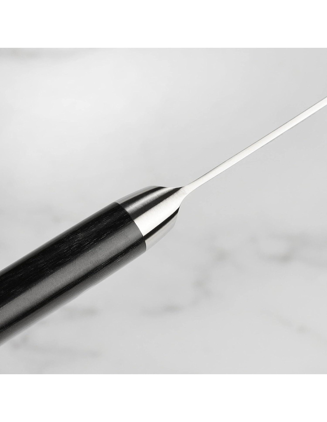 - Mango de resina negra y lienzo Micarta con dos remaches de acero inoxidable; la construcción de mango de tang completo cerrado asegura fuerza, durabilidad y equilibrio