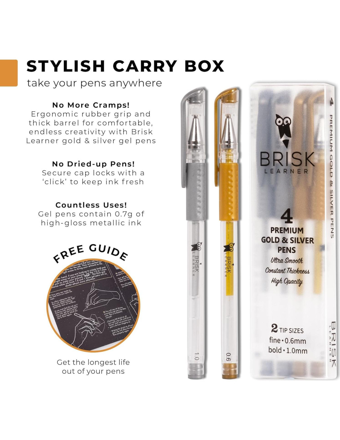 - IMPRESCINDIBLE PARA ARTISTAS; Un raro set de bolígrafos de gel metálicos dorados y plateados que te da 2 tamaños de punta diferentes: 0.6mm; 1.0mm. Ya sea que estés resaltando para efectos de brillo, añadiendo adornos decorativos para ese efecto llamativo de "pop", o caligrafía para bodas, saludos y tarjetas de vacaciones - la tinta metálica dorada y plateada te tiene cubierto. Desata tu genio creativo con tamaños finos y gruesos para detalles extra finos.