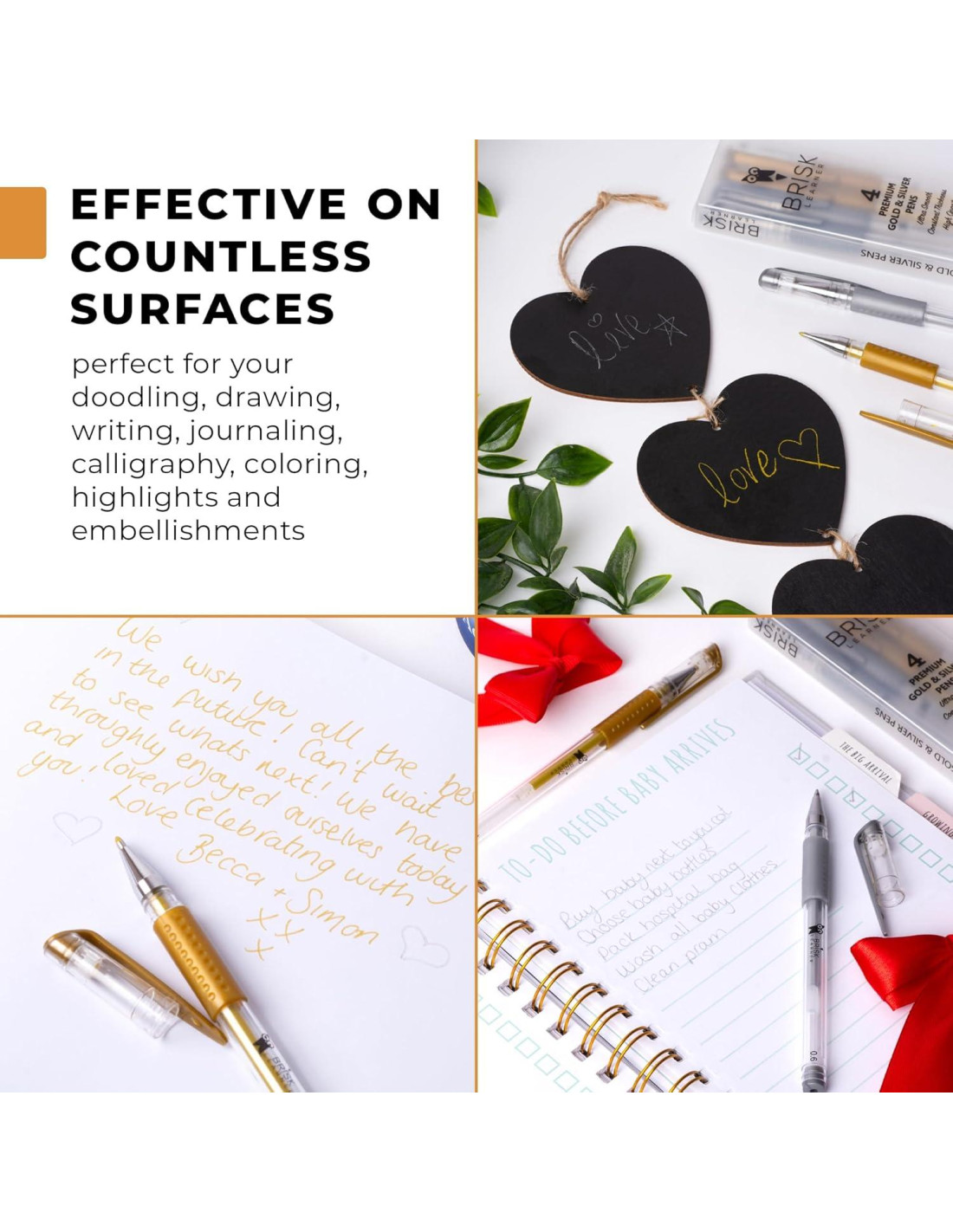 - USO INFINITO; La tinta metálica dorada y plateada de alto brillo y a base de agua no solo es excelente en papel negro/colorido. También es perfecta para tarjetas negras/coloridas, papel kraft, cartón, álbumes de recortes, tarjetas de invitación/vacaciones, sobres (de boda) y libros de invitados. Además, brilla intensamente en superficies artísticas como lápices de colores, acuarela, tinta india y marcadores de acuarela/alcohol. Perfecto para garabatear, dibujar, escribir, llevar un diario, caligrafía, colorear, resaltar y hacer álbumes de recortes.