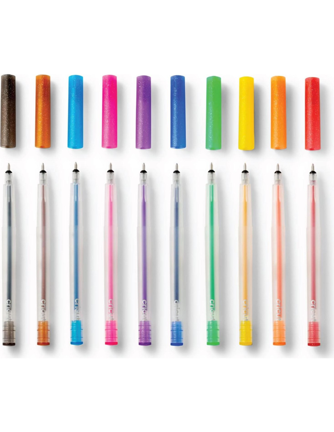 - 10 COLORES BRILLANTES - Este paquete incluye 10 bolígrafos de gel de color en Rojo, Naranja, Amarillo, Verde, Azul, Púrpura, Rosa, Azul Claro, Marrón y Negro. Usa estos tonos opulentos para agregar un toque artístico a las manualidades creadas con tu máquina de corte Cricut (se vende por separado)