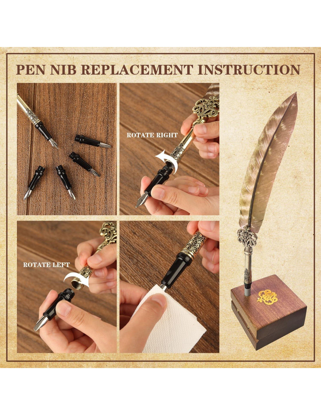 - EL JUEGO INCLUYE: 1 pluma de pluma, 5 puntas de repuesto, cartuchos de tinta, 1 soporte de pluma de madera y 1 marcador de metal.