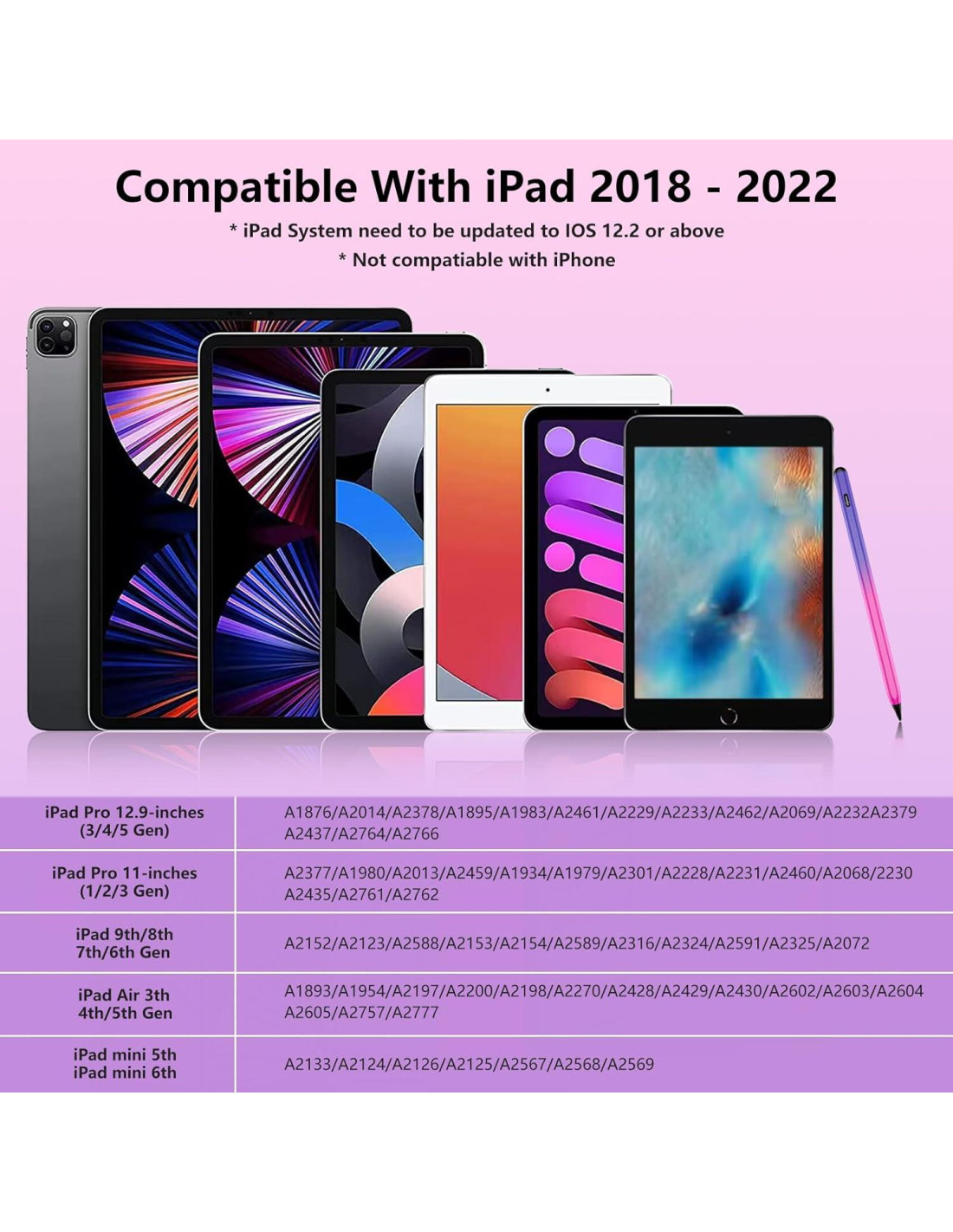 - Compatibilidad del Lápiz para iPad: Lápiz stylus para iPad compatible con modelos lanzados de Apple iPad 2018 - 2024, el lápiz para iPad puede funcionar para iPad 10/9/8/7/6, iPad mini 5/6/7 (A17 Pro), iPad Air 3/4/5/M2, iPad Pro 11 Pulgadas 1/2/3/4 Generación y iPad Pro 12.9 Pulgadas 3/4/5/6 Generación. No compatible con iPad Pro 12.9'' 1/2 Generación y otros modelos, iPhone, dispositivos Android o Microsoft.