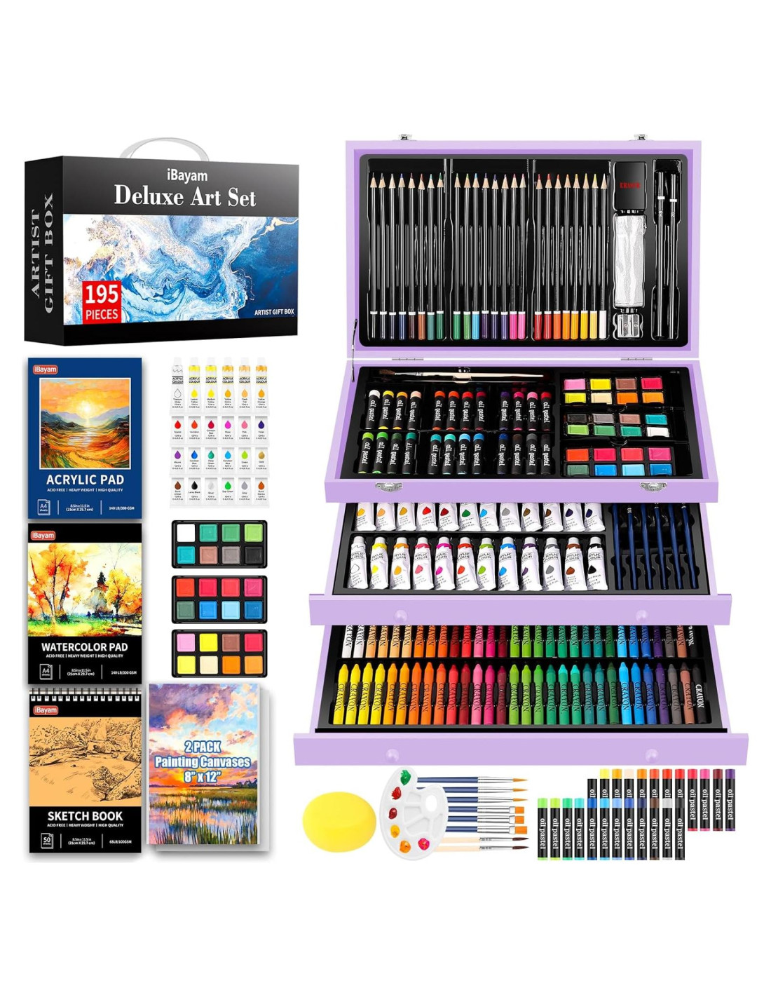 iBayam Set de Arte Deluxe, Caja de Regalo de Artista de 195 Piezas, Kit de Dibujo y Pintura de Artes y Manualidades, Suministros de Arte para Adultos Adolescentes Niños, Kits de Arte con 24 Pinturas Acrílicas, Bloc de Dibujo, Lienzos, Crayones, Lápices