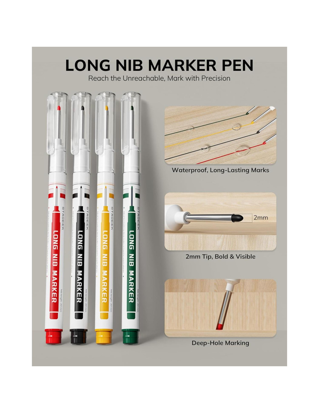 - Bolígrafos marcadores de agujero profundo: Marcadores de punta larga impermeables, ideales para marcar en superficies donde los lápices de carpintero no pueden, como vidrio, metal y plástico. Estos marcadores de cabeza larga para agujeros profundos amplían la versatilidad del juego, asegurando marcas precisas en varios materiales.