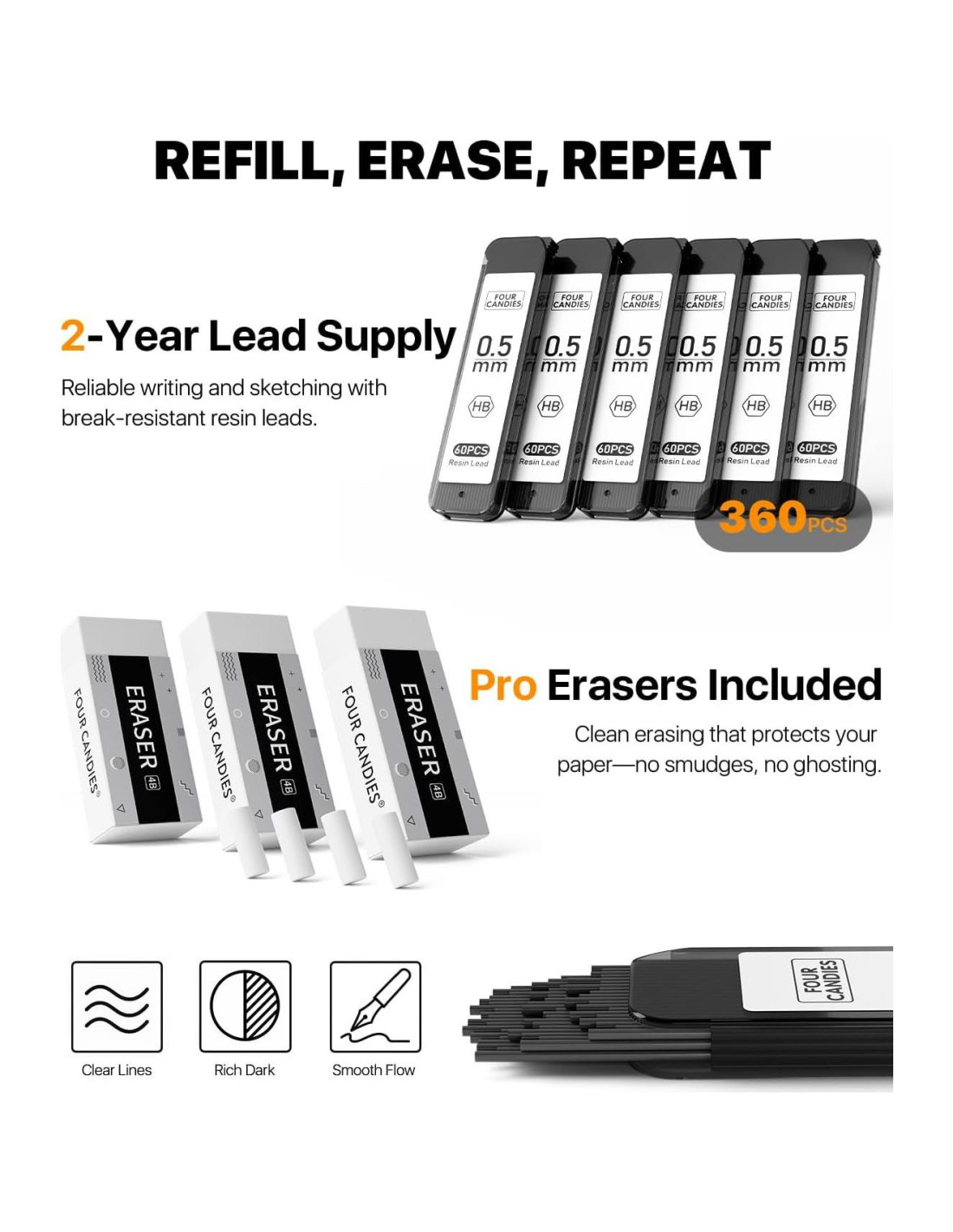 - Juego de Lápices Mecánicos: Este juego contiene 3pcs lápices de dibujo de 0.5mm y 360pcs Recargas de Mina HB, 3pcs borradores 4B, 9pcs recargas de borrador y un estuche de almacenamiento de plástico; Este juego de lápices mecánicos es adecuado para escribir, dibujar y esbozar