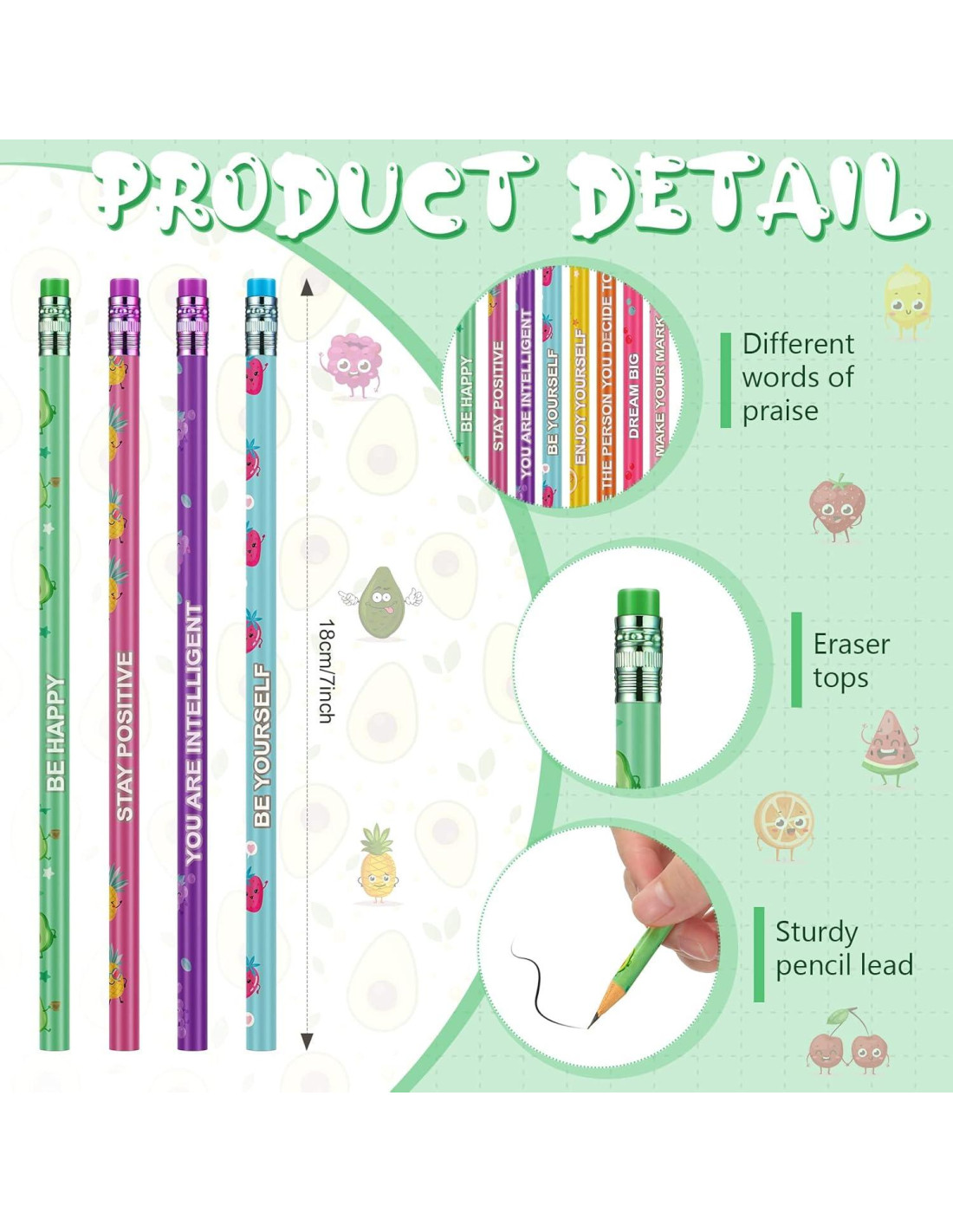 - Divertidos y Coloridos: Los lápices presentan patrones de frutas coloridos y mensajes motivacionales
