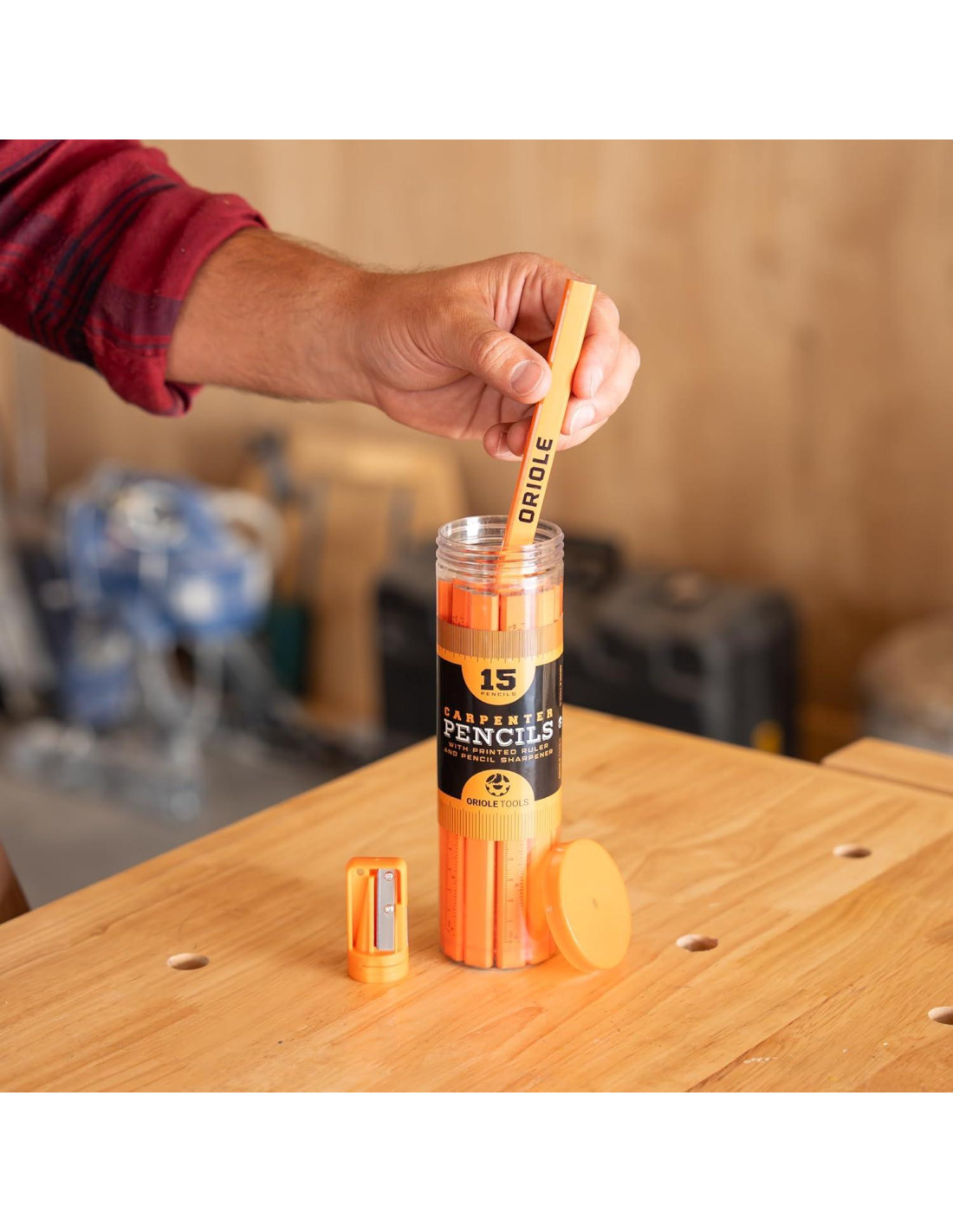 - Kit de Lápices de Carpintero Profesional: Incluye 15 lápices de construcción planos con regla impresa, 1 sacapuntas y 1 contenedor para fácil almacenamiento y organización.