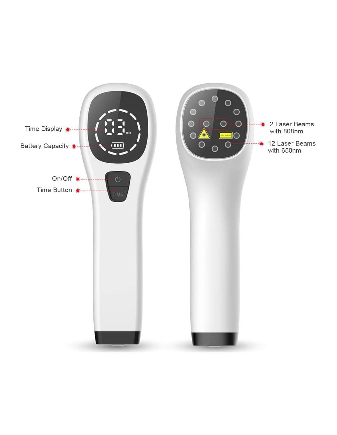 - Este dispositivo tiene una combinación perfecta de 12x diodos de 650nm y 2x diodos de 808nm. Una batería de litio recargable de 2600mAh en su interior, cuando está completamente cargada durante 2 horas, su tiempo de duración alcanza 4 días.