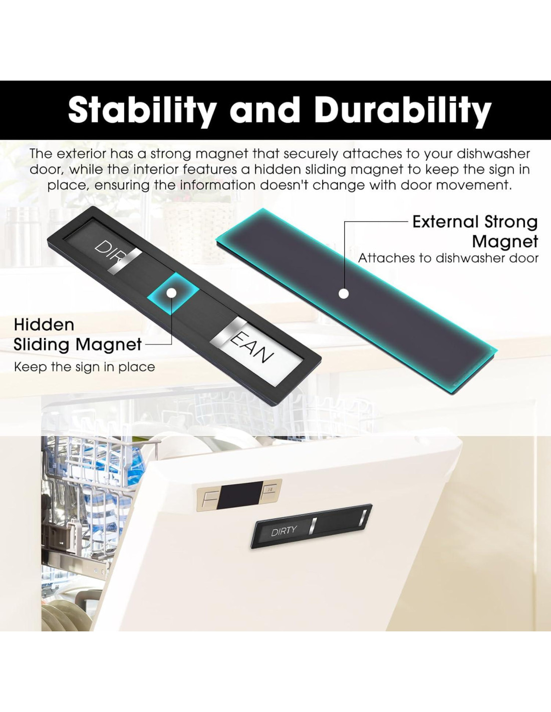 - Estabilidad y Durabilidad: El exterior tiene un imán fuerte que se adhiere de forma segura a la puerta de tu lavavajillas, mientras que el interior cuenta con un imán deslizante oculto para mantener el letrero en su lugar, asegurando que la información no cambie con el movimiento de la puerta.