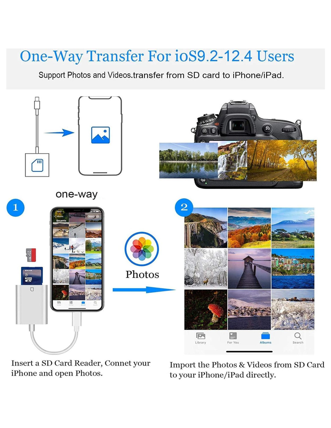 - [Fácil de usar, Plug and Play] No necesita aplicaciones de conexión de terceros, no necesita conexión a internet, Plug and Play, solo espera de 3 a 5 segundos después de conectarlo a tu dispositivo, comparte tu felicidad con tu familia y amigos en tiempo real a través de este adaptador de lector de tarjeta SD para iPhone.