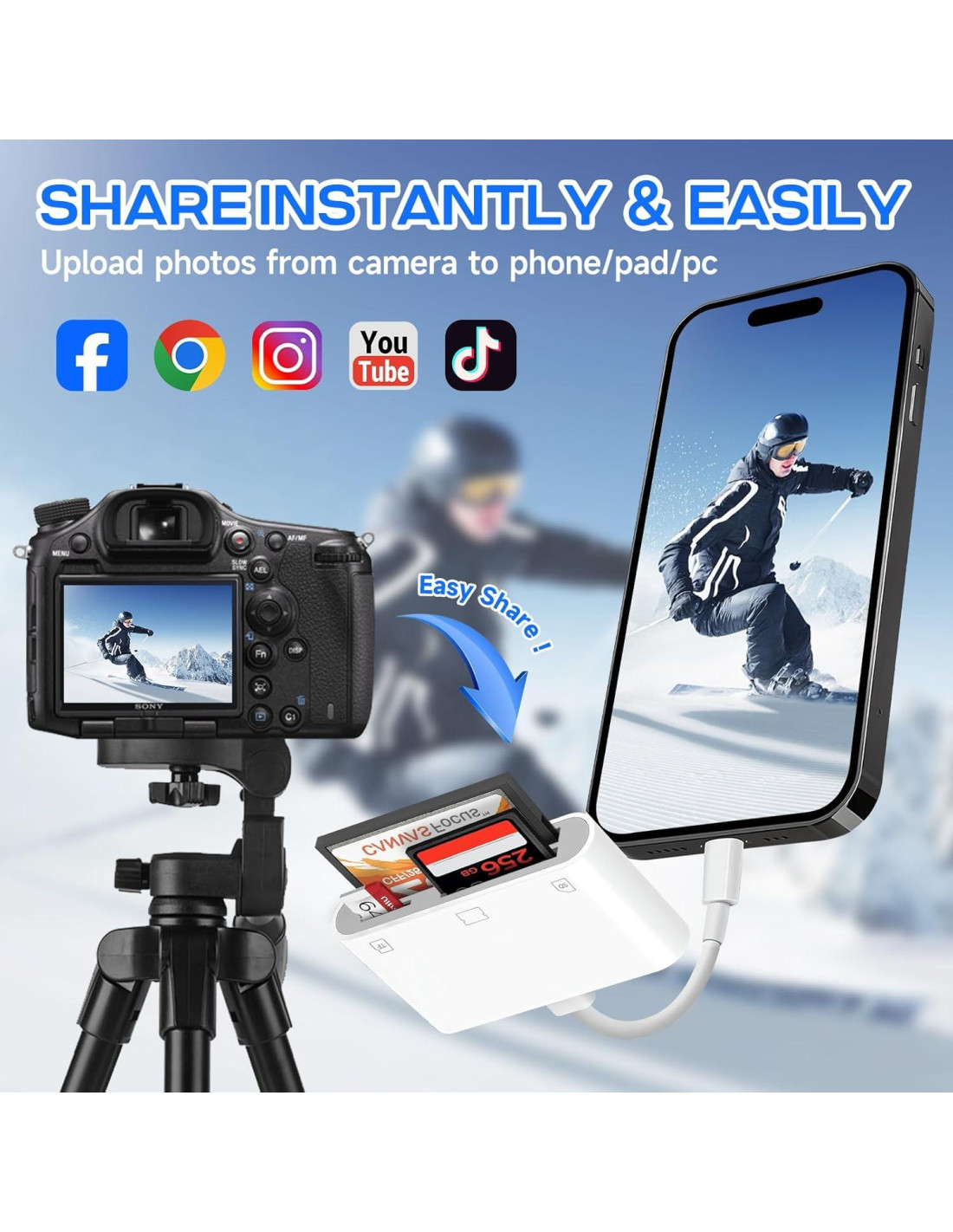 - [FÁCIL DE COMPARTIR] - El lector de tarjetas SD USB C para iPhone facilita la descarga de fotos y videos de tu cámara digital directamente a tu iPhone o iPad. Disfruta de una funcionalidad de transferencia bidireccional sin problemas adaptada para iOS 13 hasta la última iOS. Importa datos sin esfuerzo de tarjetas SD, TF o CF a tu iPhone, o exporta archivos desde tu iPhone a tarjetas SD, TF o CF. Soporta Word, PowerPoint, Excel, PDF y más.