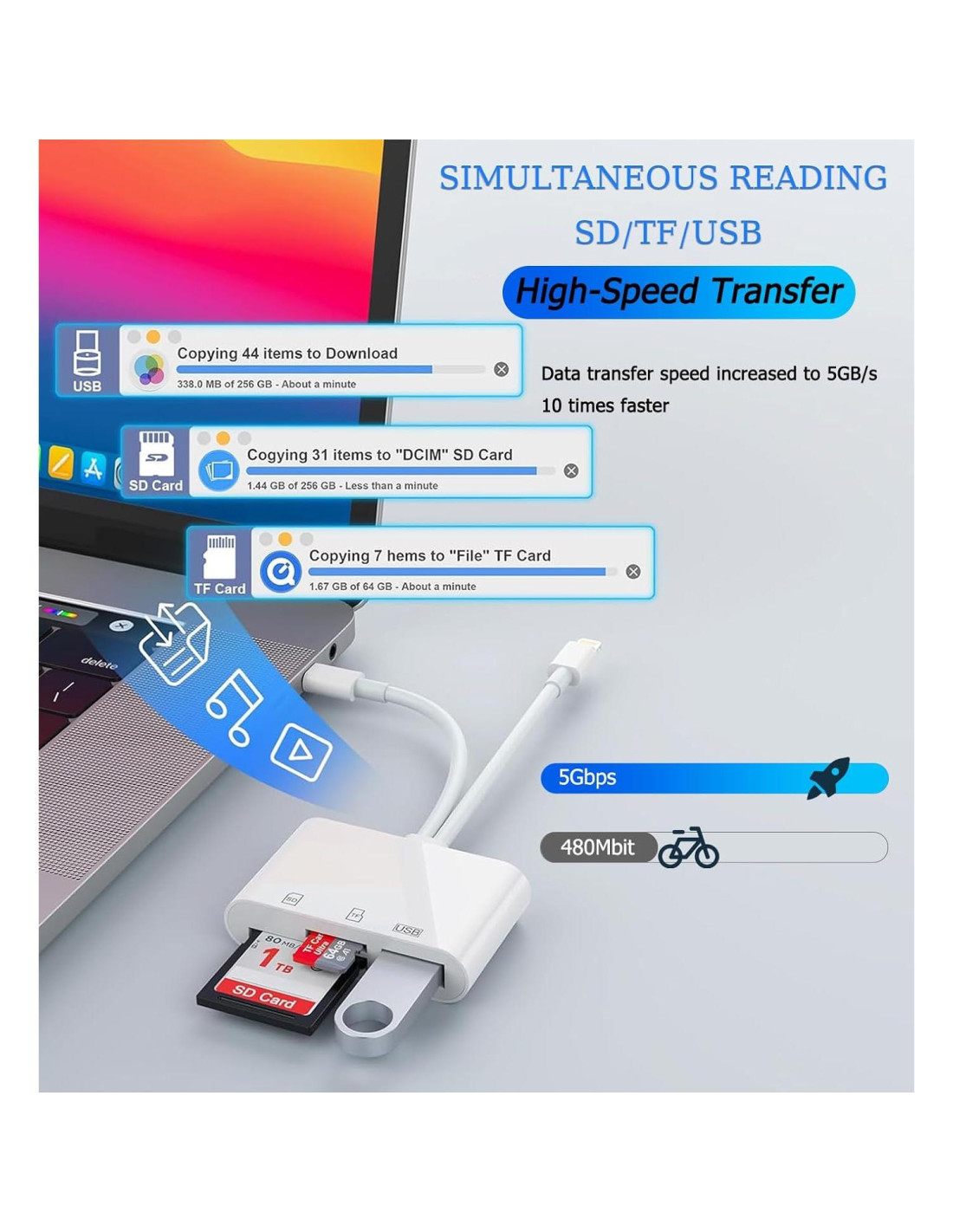 - Alta velocidad de transferencia de datos: Soporta transferencia de datos de alta velocidad de hasta 5 Gbps, lee y escribe en dos tarjetas y unidades flash USB al mismo tiempo, transfiere rápidamente fotos/videos a dispositivos, eliminando la molestia de conectar y desconectar constantemente