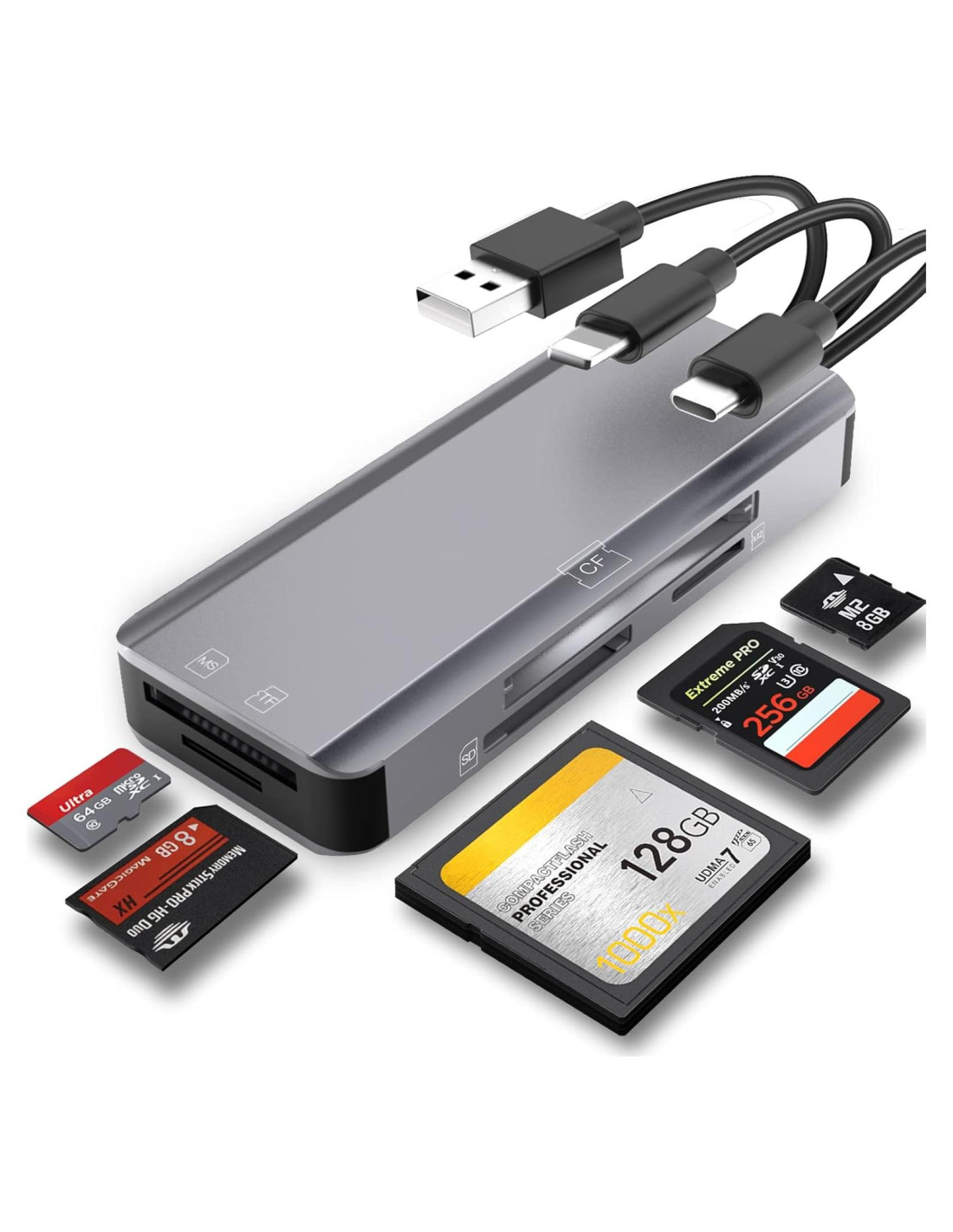 - Conectar y Usar: JOOPSHEE lector de tarjetas de memoria tiene varias interfaces, no se requiere WIFI, red o controladores, super fácil de usar. usb / usb c (tipo c) / conector i - OS / ranura para tarjeta sd / ranura para tarjeta micro sd y puerto de carga de i Phone para Phone/Pad, transfiere fácilmente fotos, videos e información de archivos.