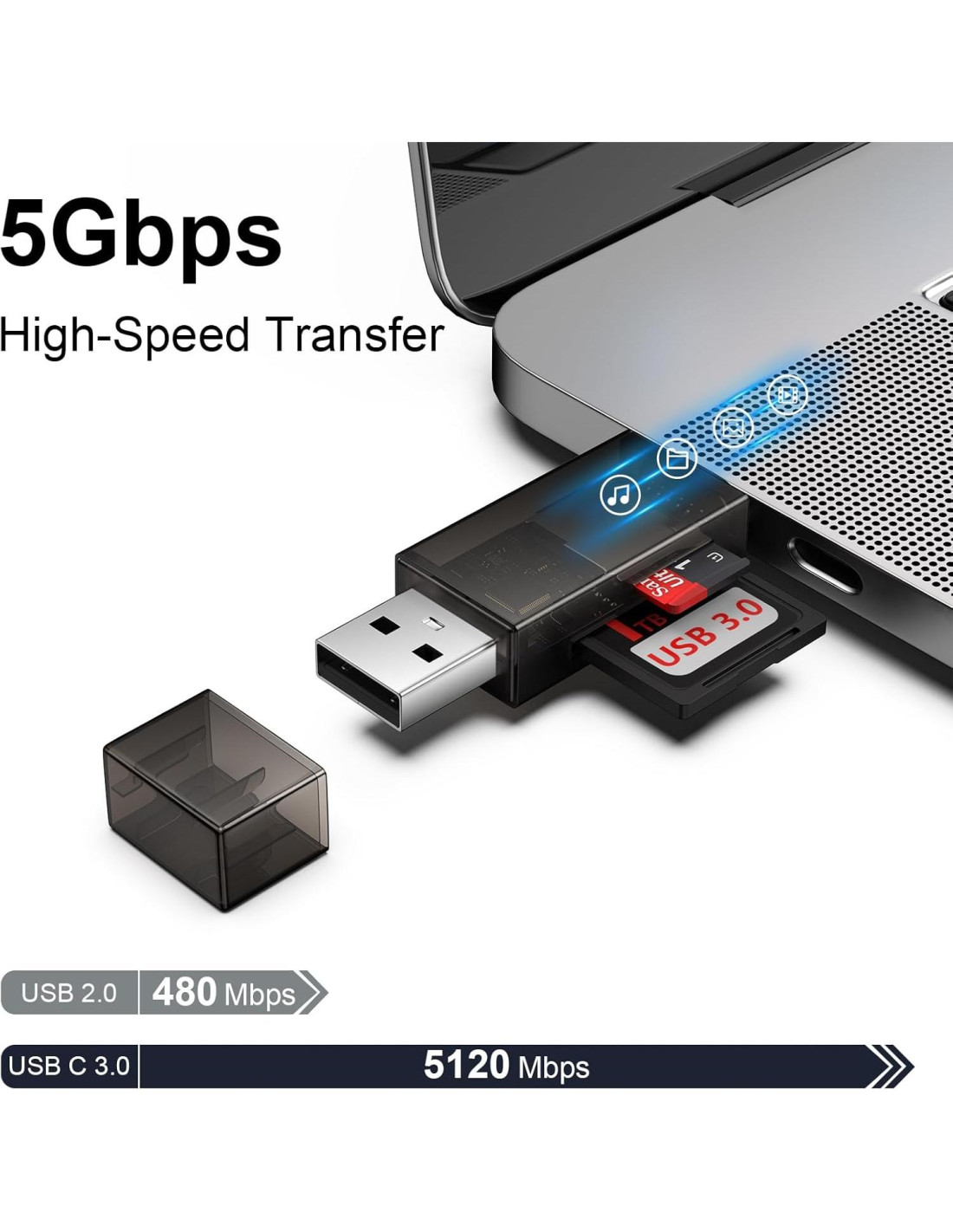 Lector de Tarjetas SD, Adaptador de Tarjeta Micro SD USB C/USB 3.0, Lector de Tarjetas de Memoria para SD/Micro SD/SDHC/SDXC/MMC Transferencia de Datos de Alta Velocidad de 5Gbps La velocidad de transferencia extremadamente rápida permite transferir más archivos en menos tiempo, reduciendo el tiempo de espera, este lector de tarjetas USB c a sd es adecuado para fotógrafos, estudios y aquellos que necesitan transferir archivos grandes 2 Tarjetas Funcionan Simultáneamente Lectura y escritura simultáneas en dos tarjetas para evitar el constante enchufar y desenchufar. Duplica tu productividad con acceso simultáneo a microSD/SD Plug and Play No requiere instalación de controladores o software, solo conecta y usa, fácil de entrar y salir 2 en 1 Lector de Tarjetas SD USB 3.0 y USB C Compatibilidad Universal Soporta Tarjetas: SD, SDHC, SDXC, RS-MMC, MicroSD, MicroSDHC, MicroSDXC de Cámara/Gopro/Cámara de Salpicadura/Cámara de Vigilancia/Monitor de Bebé/Cámara Digital Teléfono Móvil Compatible: iPhone 16e/16/16 Pro/16 Pro Max/16 Plus/15/15 Pro/15 Pro Max/15 Plus Samsung Galaxy S25 Edge/S25/S25+/S25 Ultra/S24 FE/S24/S24+/S24 Ultra/S23 FE/S23/S23 Ultra/S23 Plus/S22/S22 Ultra/S22 Plus/S21 FE/S21/S21 Ultra/S21 Plus/S20 FE/S20 Plus/S20 Ultra Samsung Galaxy Z Flip 6 5 4 3/Z Fold 6 5 4 3 2/Note 20 Ultra 10 9 8/S10E/S10 Lite/S10/S10 Plus/S9/S9 Plus/S8/S8 Plus Samsung Galaxy A56 A36 A26 A16 A55 A35 A25 A15 A54 A14 A03S A13 A53 A02S A12 A32 A42 A52 A11 A21 A51 A71 A10E A20 A50 Google Pixel 9a/9 Pro XL/9 Pro/9/9 Pro Fold/8a/8 Pro/8/Fold/7a/7 Pro/7/6a/6 Pro/6/5a/5/4a/4 XL/4/3a XL/3a/3 XL/3/2 XL/2/XL Laptops Compatibles: para MacBook Pro (Después de 2016), MacBook Air M3/M2/M1, MacBook 2017/2016/2015, iMac Pro, iMac (Después de 2017), Mac mini 2018, Surface Book 2, Surface Go, Pixelbook, Pixelbook Go, Dell XPS 15/13, computadora, pc, chromebook Tablets Compatibles: para iPad Pro 2022/2021/2020/2018, iPad mini 6 iPad Air 2022/2020 para Samsung Galaxy Tab S9/S8/S7/S5e/S4/A7 Sistema Compatible: Windows 11/10/8.1/8/7/XP/Vista, macOS, Linux, Chrome OS