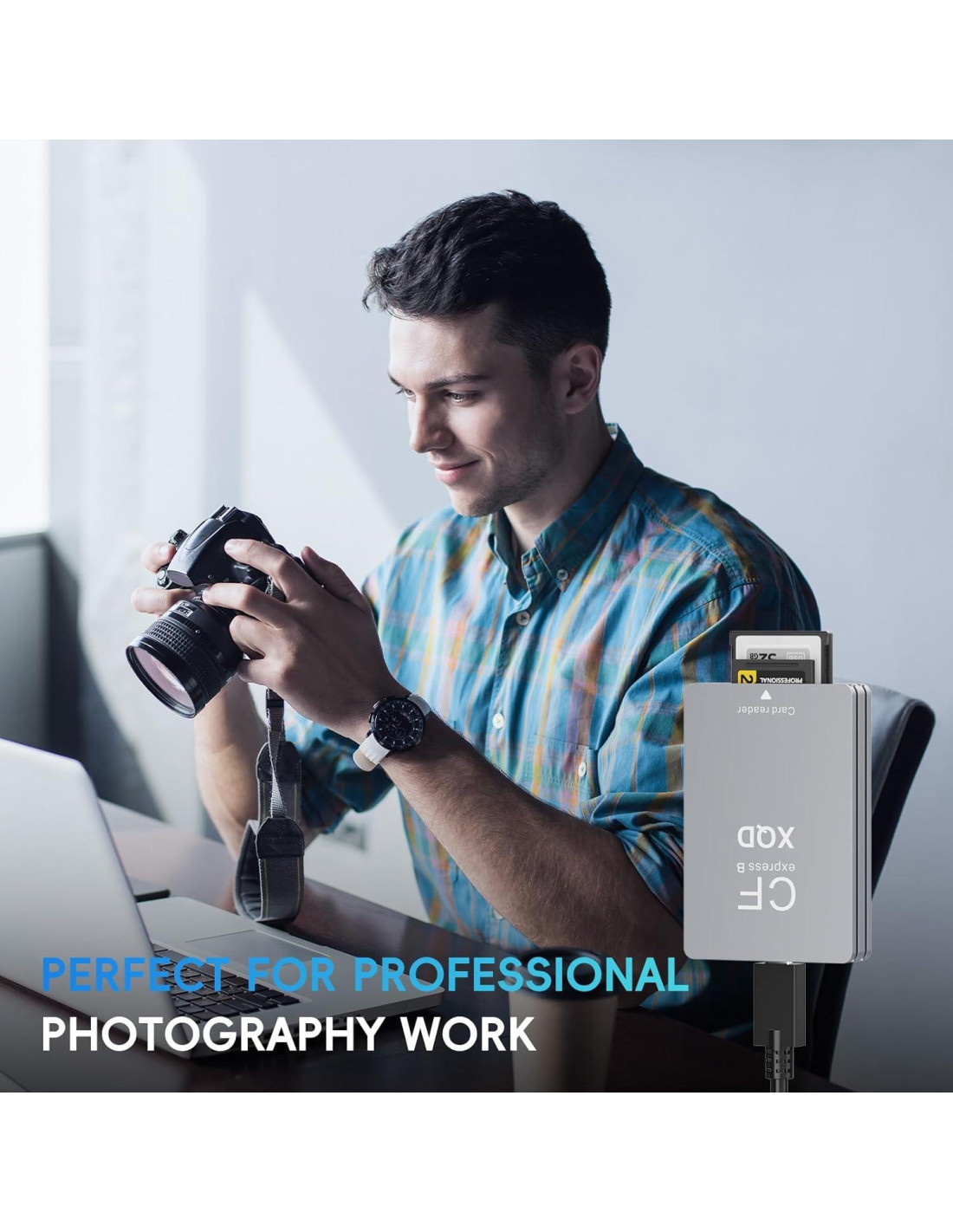 - DISEÑADO PARA LA VIDA EN EL CAMINO Dondequiera que vayas, el pequeño y compacto lector de tarjetas CFexpress tipo b de metal trabaja con tu laptop para crear una estación de trabajo móvil compacta. Optimiza tu flujo de trabajo en la cima de una montaña, en el asiento trasero de un viaje, o en cualquier otro lugar al que te lleve la vida. Lector de tarjetas de memoria CFexpress Tipo B/XQD/SD de nivel profesional con calidad de metal, está ingeniosamente diseñado para superar a la competencia como el eslabón más fuerte en tu flujo de trabajo de fotografía, video, audio o imagen digital