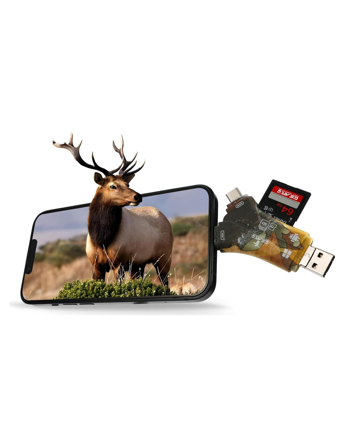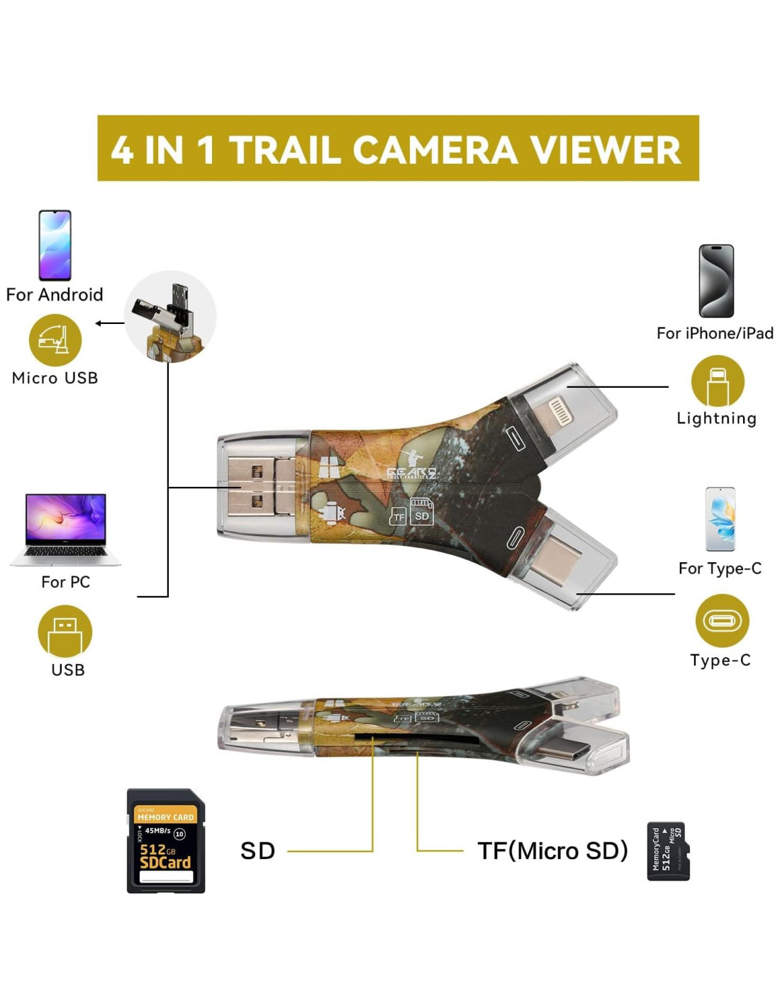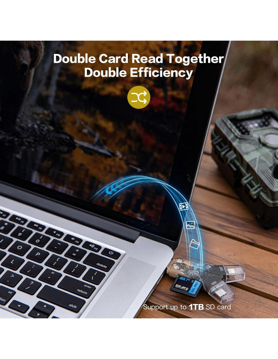 - Soporte para Tarjetas SD y TF de Múltiples Tipos: Las ranuras de tarjeta dual admiten los siguientes tipos de tarjetas: SD, SDXC, SDHC, Micro SD, Micro SDXC y Micro SDHC. Además, este lector de tarjetas admite hasta 1TB de tarjeta SD/Micro SD, tal capacidad grande puede leer y almacenar más imágenes y videos de vida silvestre, ayudando a los cazadores a dominar más datos antes de cazar.