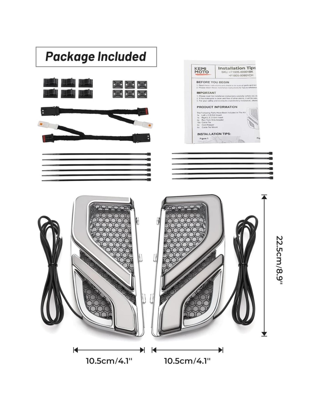 - Paquete Incluido: Un Par de Señales de Giro Inferiores de Cromo (Izquierda y Derecha) + Adaptador de Cable de Giro y Funcionamiento x2 + Bridas x10 + Sujetador de Cable x6 + Montaje de Brida x6 + Instrucciones de Instalación