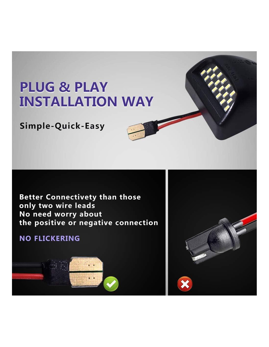 - 1. luces de placa de licencia: Chips LED 18SMD 3014 de alta potencia incorporados para maximizar la iluminación trasera